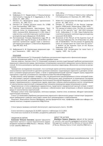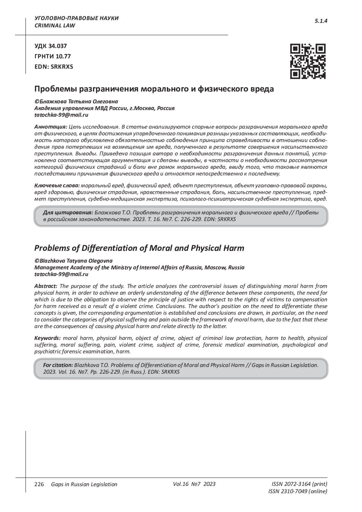БЛАЖКОВА Т. О. ПРОБЛЕМЫ РАЗГРАНИЧЕНИЯ МОРАЛЬНОГО И ФИЗИЧЕСКОГО ВРЕДА // ПРОБЕЛЫ В РОССИЙСКОМ ЗАКОНОДАТЕЛЬСТВЕ. 2023. Т. 16 № 7 (42 СТ.)
