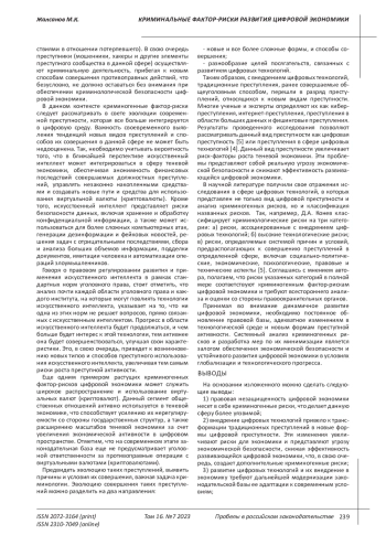 ЖАЛСАНОВ М. К. КРИМИНАЛЬНЫЕ ФАКТОР-РИСКИ РАЗВИТИЯ ЦИФРОВОЙ ЭКОНОМИКИ // ПРОБЕЛЫ В РОССИЙСКОМ ЗАКОНОДАТЕЛЬСТВЕ. 2023. Т. 16 № 7 (42 СТ.)
