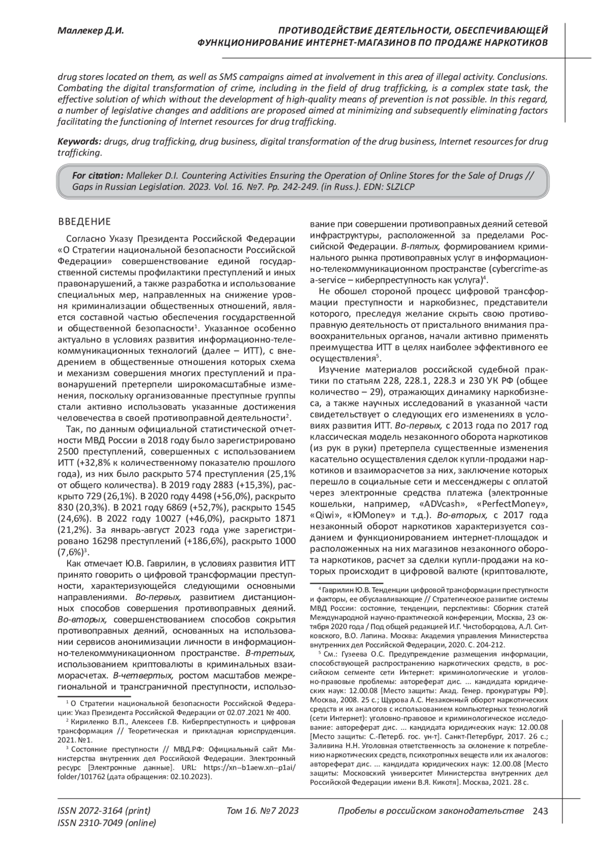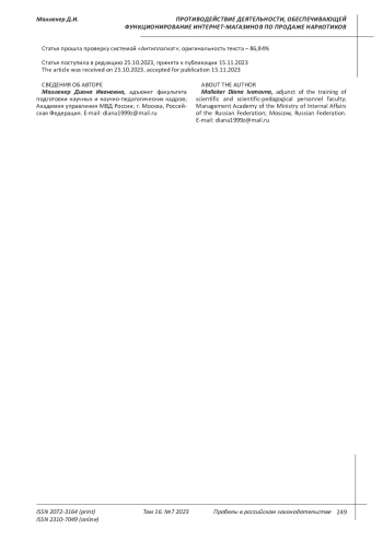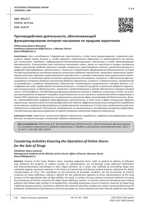 Цель исследования. Современная преступность, в том числе организованная, стремится расширить сферы своего влияния и, следуя прогрессу современного общества, ее представители все активнее используют передовые информационно-телекоммуникационные технологии в своей противоправной деятельности. В результате чего постоянно возникают новые, ранее не известные в теории уголовного права и российской судебной практике способы совершения противоправных деяний, свидетельствующие о цифровой трансформации преступности. Указанное способствует формированию благоприятных условий для функционирования интернет-ресурсов незаконного оборота наркотиков, затрудняя привлечение правоохранительными органами представителей наркобизнеса к соответствующему виду юридической ответственности. В настоящее время остается неразрешенным ряд вопросов, связанных с обеспечением функционирования интернет-ресурсов незаконного оборота наркотиков, а именно: 1) деятельности, направленной на разработку и создание программного обеспечения, позволяющего осуществлять передачу данных в зашифрованном виде, предоставляя анонимный доступ к интернет-ресурсам незаконного оборота наркотиков (анонимизация); 2) деятельности, связанной с предоставлением в аренду абонентских номеров сотовой связи и SIP-телефонии, способствующих функционированию каналов и страниц в социальных сетях, на которых размещаются интернет-площадки и расположенные на них магазины незаконного сбыта наркотиков, а также СМС-кампаний, направленных на вовлечение в указанную сферу противоправной деятельности. Выводы. Противодействие цифровой трансформации преступности, в том числе в сфере незаконного оборота наркотиков, является комплексной государственной задачей, эффективное решение которой без выработки качественных средств предупреждения не представляется возможным. В этой связи предлагается ряд законодательных изменений и дополнений, направленных на минимизацию и последующее устранение факторов, способствующих функционированию интернет-ресурсов незаконного оборота наркотиков.