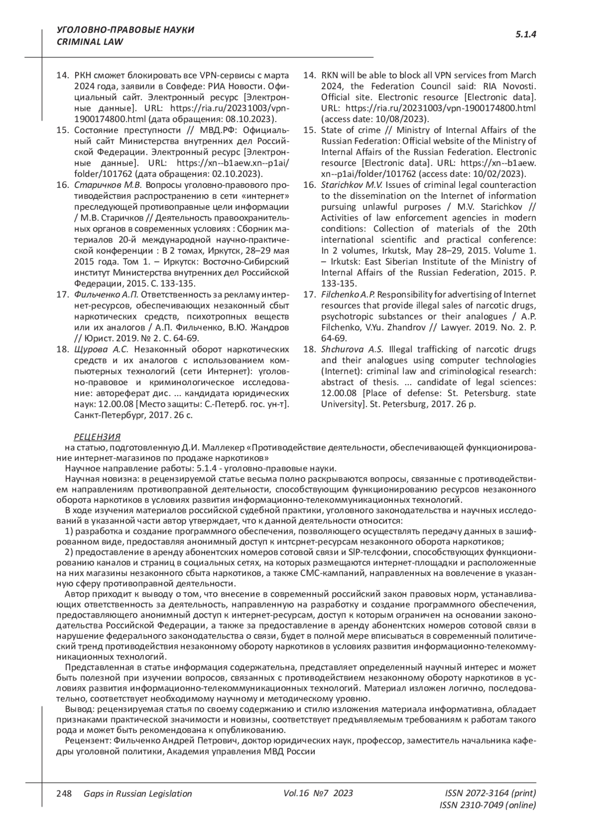 17. Фильченко А.П. Ответственность за рекламу интернет-ресурсов, обеспечивающих незаконный сбыт наркотических средств, психотропных веществ или их аналогов / А.П. Фильченко, В.Ю. Жандров // Юрист. 2019. № 2. С. 64-69. EDN: YWWWDZ