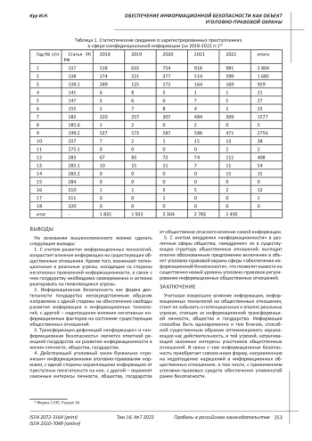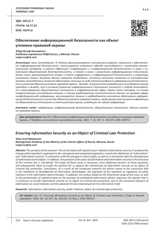 КУР И. Н. ОБЕСПЕЧЕНИЕ ИНФОРМАЦИОННОЙ БЕЗОПАСНОСТИ КАК ОБЪЕКТ УГОЛОВНО-ПРАВОВОЙ ОХРАНЫ // ПРОБЕЛЫ В РОССИЙСКОМ ЗАКОНОДАТЕЛЬСТВЕ. 2023. Т. 16 № 7 (42 СТ.)