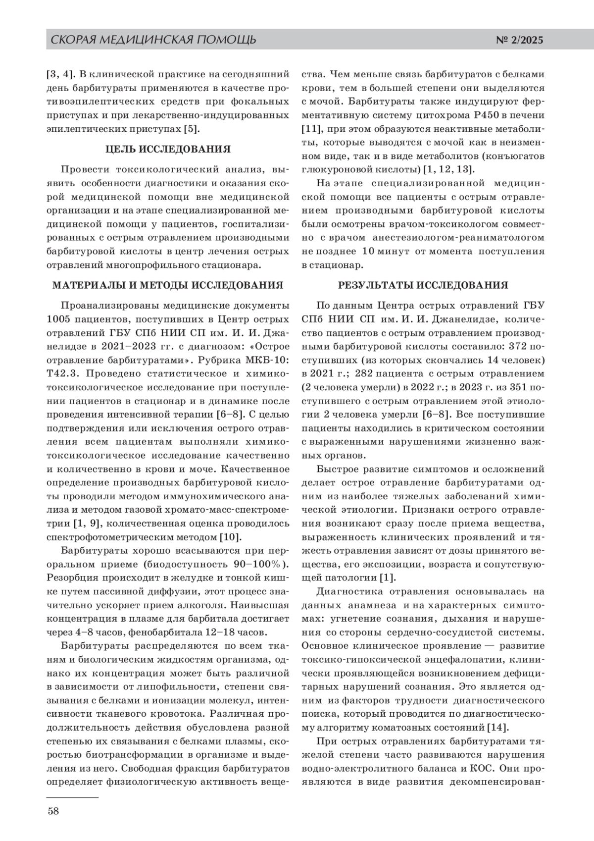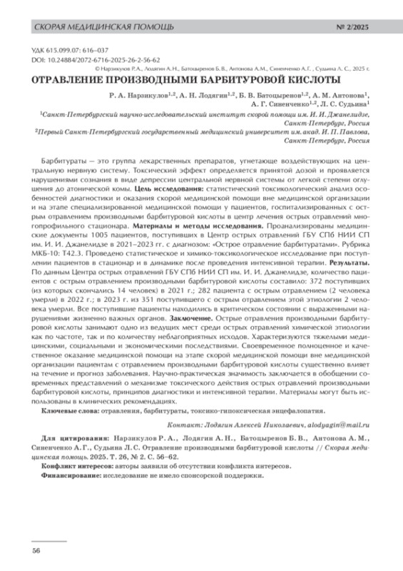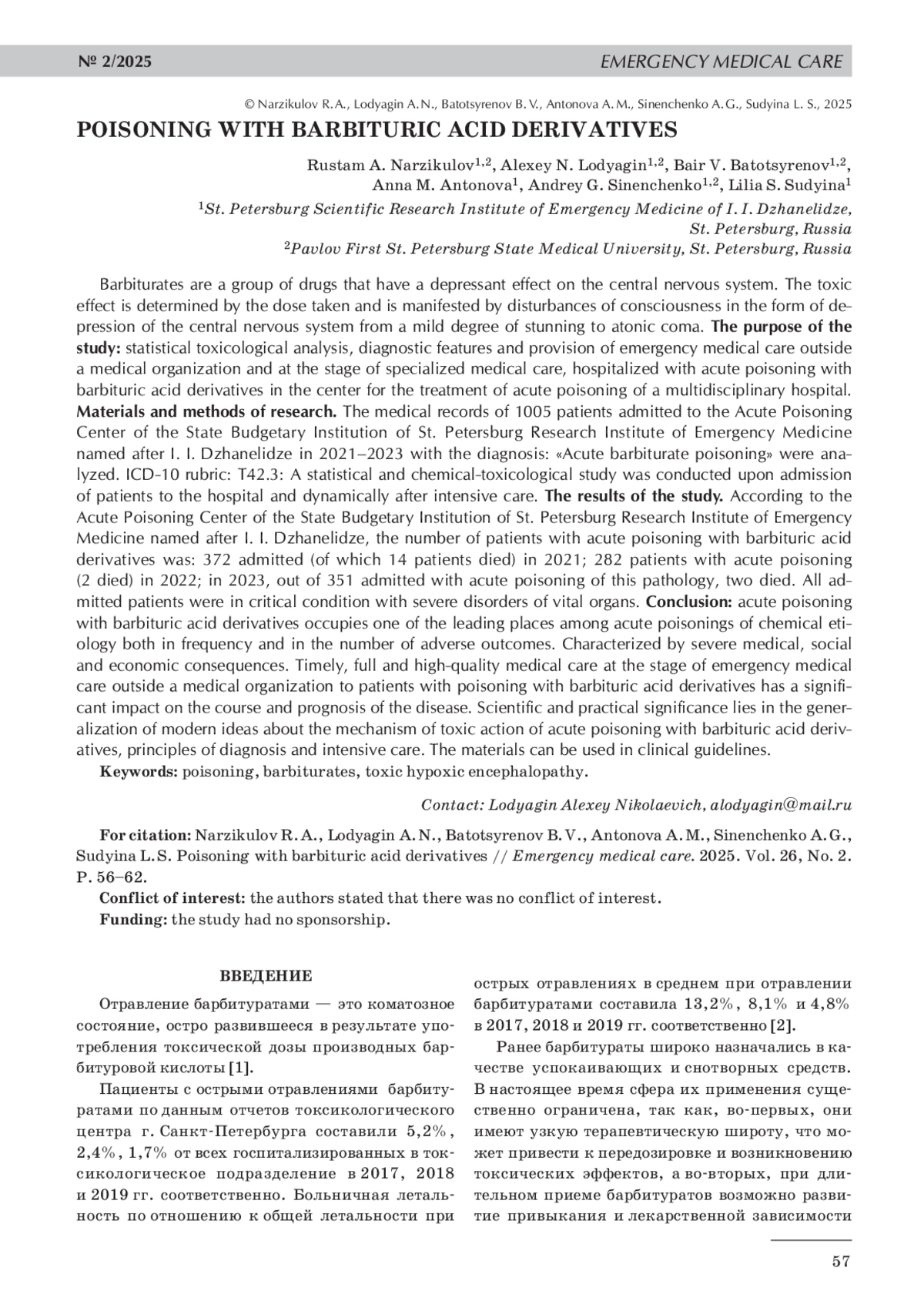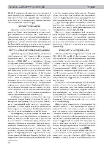 Барбитураты — это группа лекарственных препаратов, угнетающе воздействующих на центральную нервную систему. Токсический эффект определяется принятой дозой и проявляется нарушениями сознания в виде депрессии центральной нервной системы от легкой степени оглушения до атонической комы. Цель исследования: статистический токсикологический анализ особенностей диагностики и оказания скорой медицинской помощи вне медицинской организации и на этапе специализированной медицинской помощи у пациентов, госпитализированных с острым отравлением производными барбитуровой кислоты в центр лечения острых отравлений многопрофильного стационара. Материалы и методы исследования. Проанализированы медицинские документы 1005 пациентов, поступивших в Центр острых отравлений ГБУ СПб НИИ СП им. И. И. Джанелидзе в 2021–2023 гг. с диагнозом: «Острое отравление барбитуратами». Рубрика МКБ‑10: Т42.3. Проведено статистическое и химико‑токсикологическое исследование при поступлении пациентов в стационар и в динамике после проведения интенсивной терапии. Результаты. По данным Центра острых отравлений ГБУ СПб НИИ СП им. И. И. Джанелидзе, количество пациентов с острым отравлением производными барбитуровой кислоты составило: 372 поступивших (из которых скончались 14 человек) в 2021 г.; 282 пациента с острым отравлением (2 человека умерли) в 2022 г.; в 2023 г. из 351 поступившего с острым отравлением этой этиологии 2 человека умерли. Все поступившие пациенты находились в критическом состоянии с выраженными нарушениями жизненно важных органов. Заключение. Острые отравления производными барбитуровой кислоты занимают одно из ведущих мест среди острых отравлений химической этиологии как по частоте, так и по количеству неблагоприятных исходов. Характеризуются тяжелыми медицинскими, социальными и экономическими последствиями. Своевременное полноценное и качественное оказание медицинской помощи на этапе скорой медицинской помощи вне медицинской организации пациентам с отравлением производными барбитуровой кислоты существенно влияет на течение и прогноз заболевания. Научно-практическая значимость заключается в обобщении современных представлений о механизме токсического действия острых отравлений производными барбитуровой кислоты, принципов диагностики и интенсивной терапии. Материалы могут быть использованы в клинических рекомендациях.