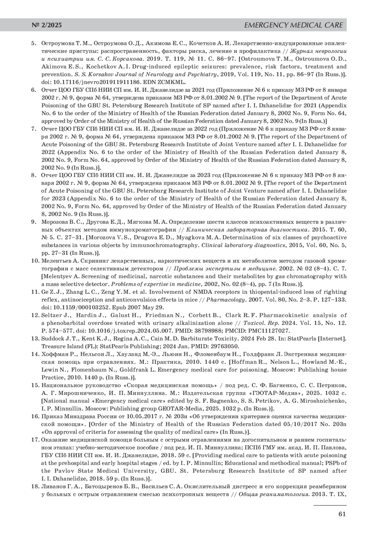 Providing medical care to patients with acute poisoning at the prehospital and early hospital stages / еd. by I. P. Minnullin; Educational and methodical manual; PSPb of the Pavlov State Medical University, GBU. St. Petersburg Research Institute of SP named after I. I. Dzhanelidze, 2018. 59 p. (In Russ.).
