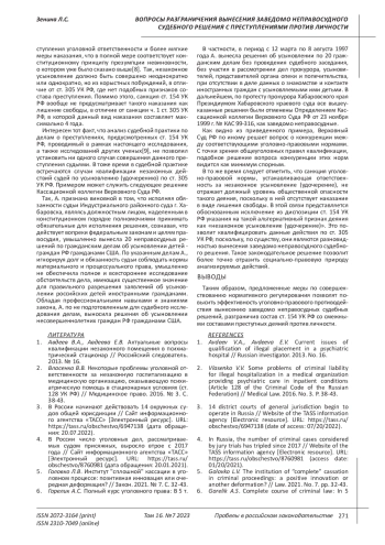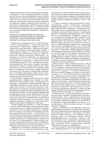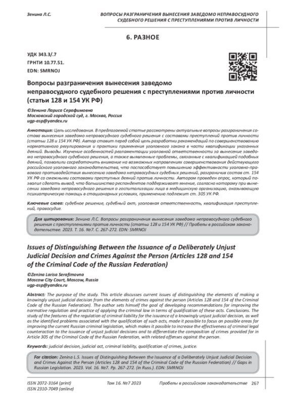 ЗЕНИНА Л. С. ВОПРОСЫ РАЗГРАНИЧЕНИЯ ВЫНЕСЕНИЯ ЗАВЕДОМО НЕПРАВОСУДНОГО СУДЕБНОГО РЕШЕНИЯ С ПРЕСТУПЛЕНИЯМИ ПРОТИВ ЛИЧНОСТИ (СТАТЬИ 128 И 154 УК РФ) // ПРОБЕЛЫ В РОССИЙСКОМ ЗАКОНОДАТЕЛЬСТВЕ. 2023. Т. 16 № 7 (42 СТ.)