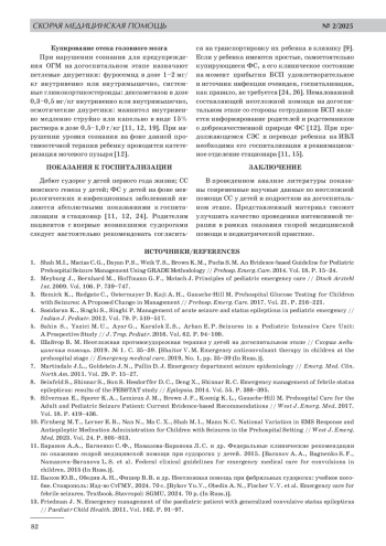 9. Silverman E., Sporer K. A., Lemieux J. M., Brown J. F., Koenig K. L., Gausche-Hill M. Prehospital Care for the Adult and Pediatric Seizure Patient: Current Evidence-based Recommendations // West J. Emerg. Med. 2017. Vol. 18. P. 419-436.