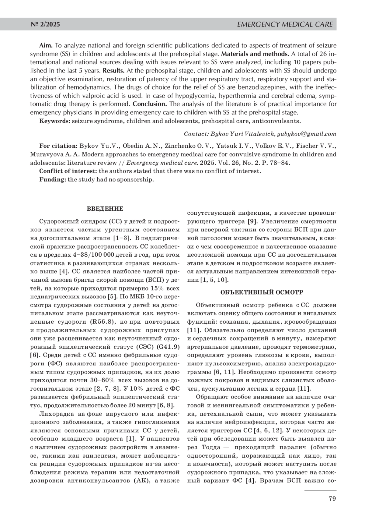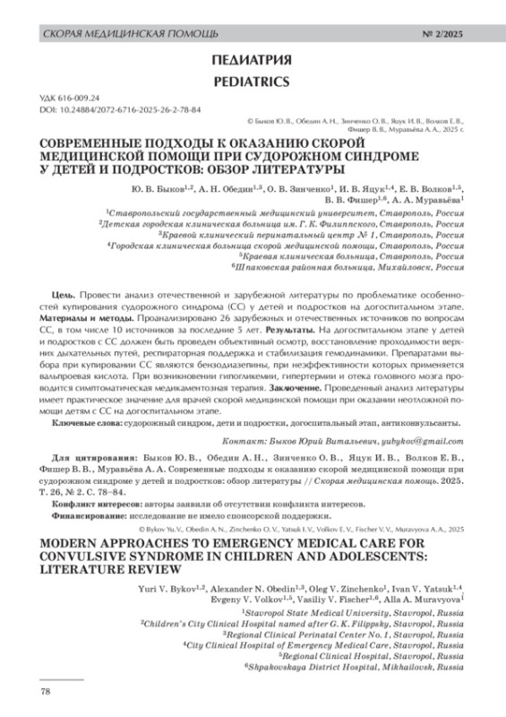 Shaitor V. M. Emergency anticonvulsant therapy in children at the prehospital stage // Emergency medical care, 2019, No. 1, pp. 35-39 (In Russ.).