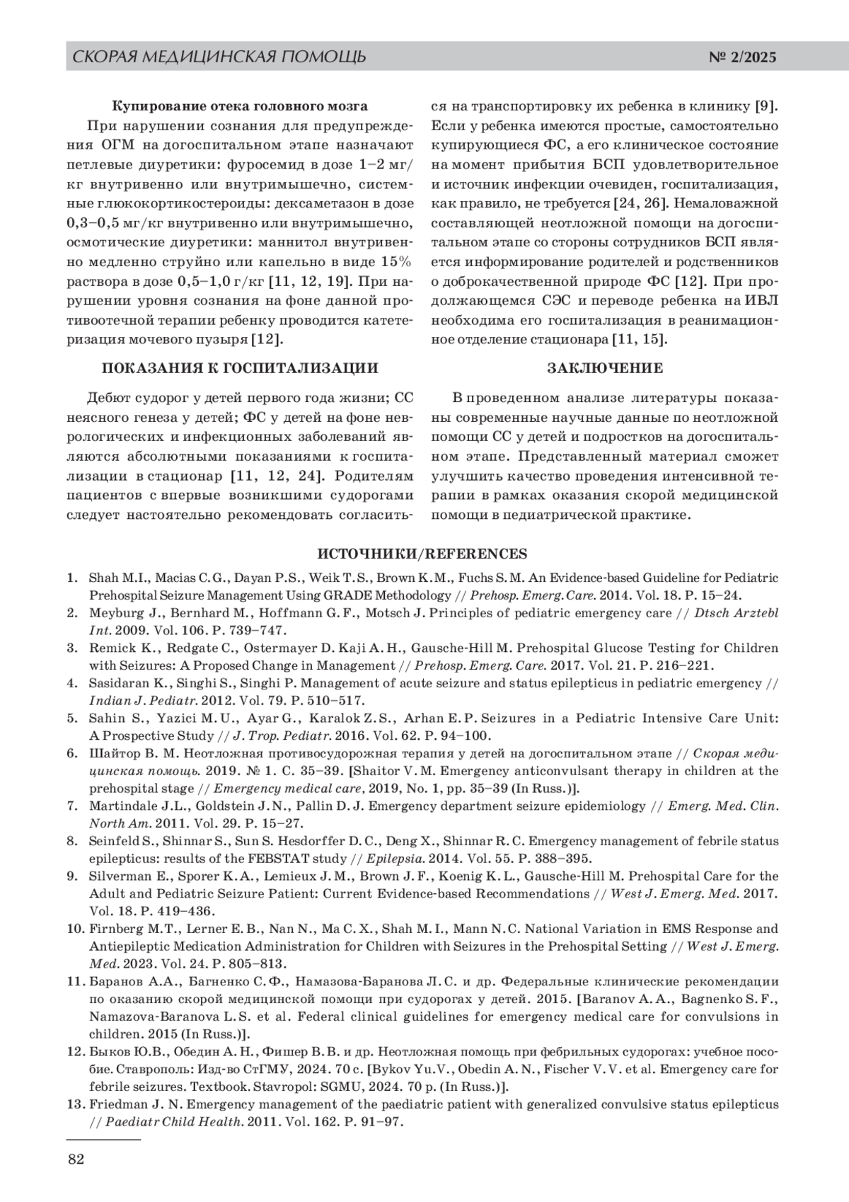 1. Shah M.I., Macias C. G., Dayan P. S., Weik T. S., Brown K. M., Fuchs S. M. An Evidence-based Guideline for Pediatric Prehospital Seizure Management Using GRADE Methodology // Prehosp. Emerg. Care. 2014. Vol. 18. P. 15-24.
