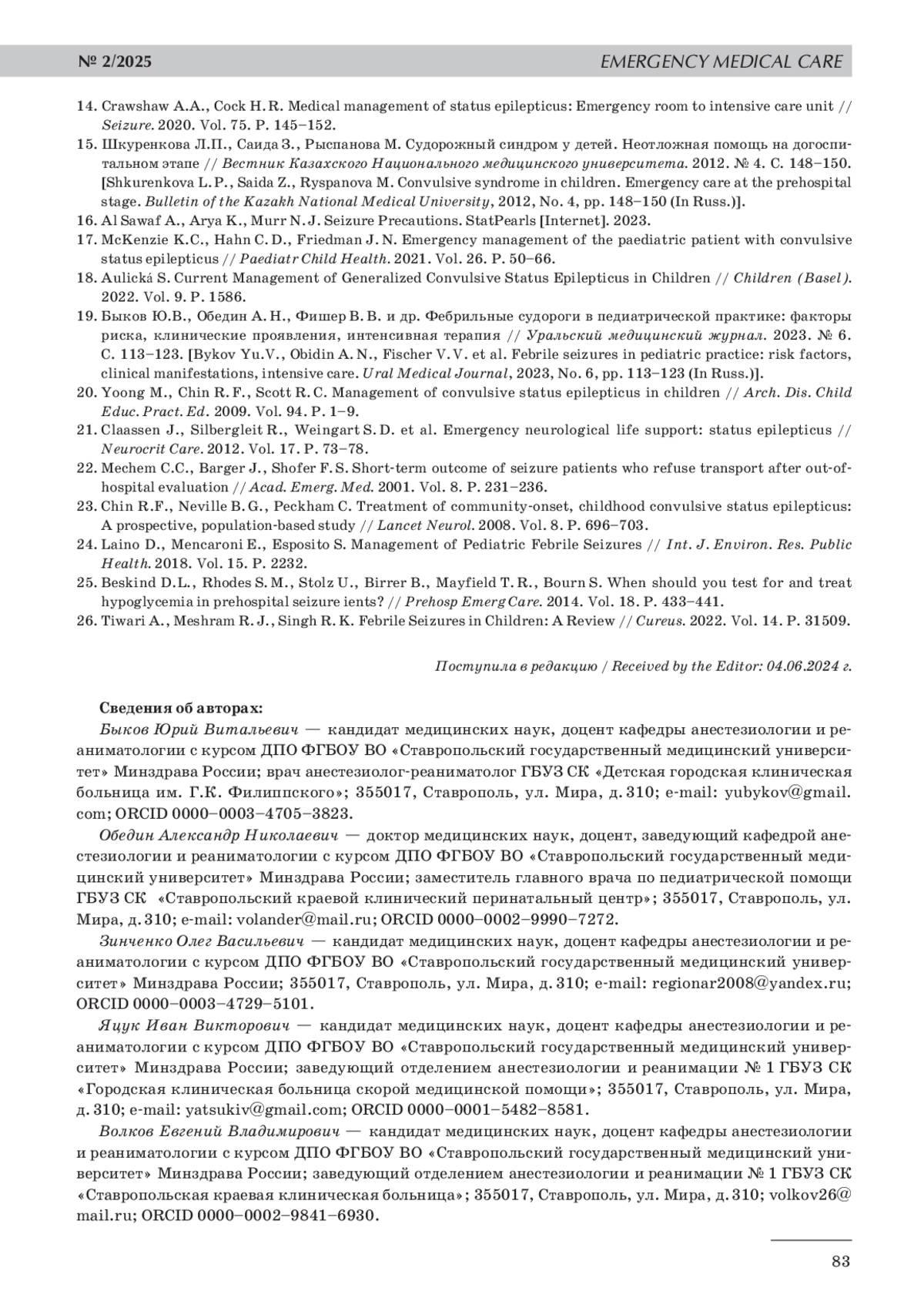 14. Crawshaw A.A., Cock H. R. Medical management of status epilepticus: Emergency room to intensive care unit // Seizure. 2020. Vol. 75. P. 145-152.
