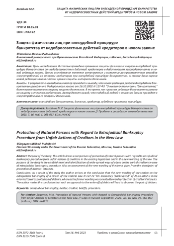 Статья: ЗАЩИТА ФИЗИЧЕСКИХ ЛИЦ ПРИ ВНЕСУДЕБНОЙ ПРОЦЕДУРЕ БАНКРОТСТВА ОТ НЕДОБРОСОВЕСТНЫХ ДЕЙСТВИЙ КРЕДИТОРОВ В НОВОМ ЗАКОНЕ (2023)