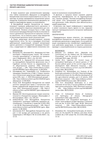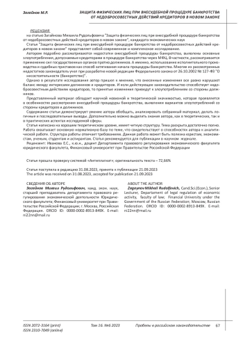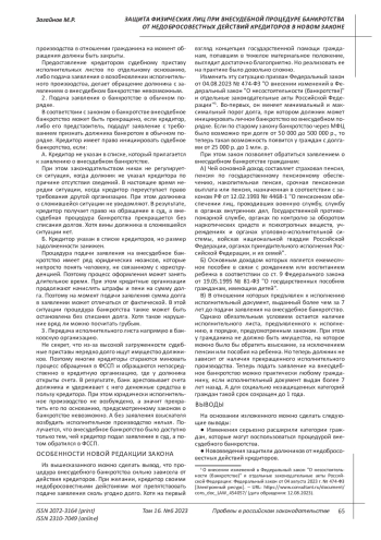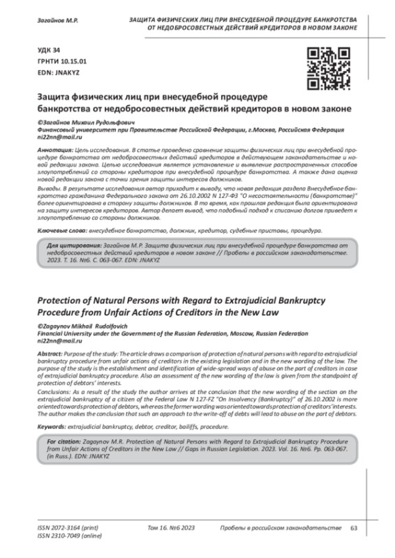 ЗАГАЙНОВ М. Р. ЗАЩИТА ФИЗИЧЕСКИХ ЛИЦ ПРИ ВНЕСУДЕБНОЙ ПРОЦЕДУРЕ БАНКРОТСТВА ОТ НЕДОБРОСОВЕСТНЫХ ДЕЙСТВИЙ КРЕДИТОРОВ В НОВОМ ЗАКОНЕ // ПРОБЕЛЫ В РОССИЙСКОМ ЗАКОНОДАТЕЛЬСТВЕ. 2023. Т. 16 № 6
