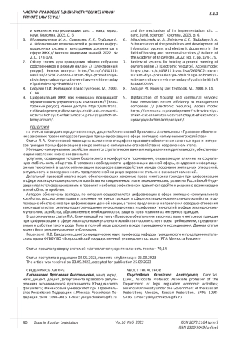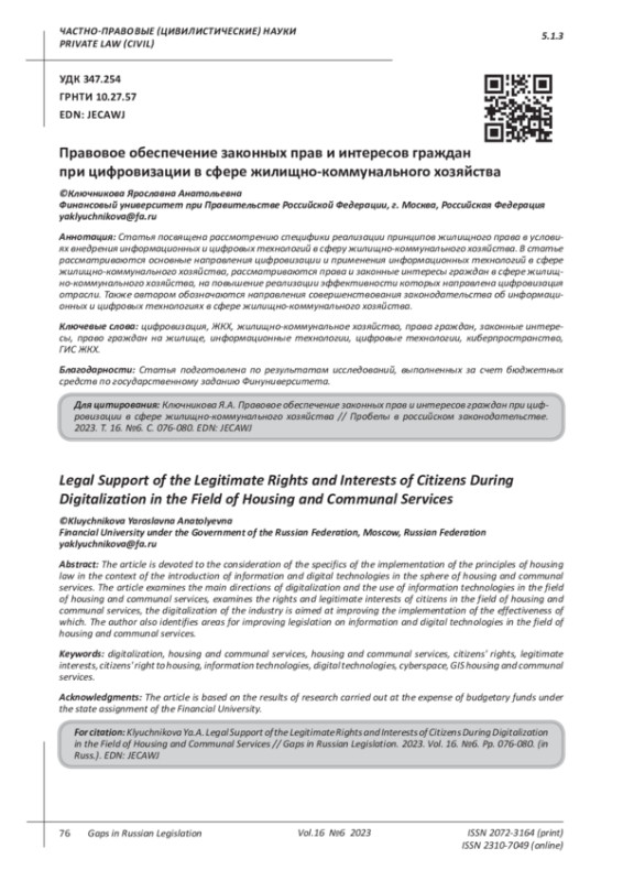 КЛЮЧНИКОВА Я. А. ПРАВОВОЕ ОБЕСПЕЧЕНИЕ ЗАКОННЫХ ПРАВ И ИНТЕРЕСОВ ГРАЖДАН ПРИ ЦИФРОВИЗАЦИИ В СФЕРЕ ЖИЛИЩНО-КОММУНАЛЬНОГО ХОЗЯЙСТВА // ПРОБЕЛЫ В РОССИЙСКОМ ЗАКОНОДАТЕЛЬСТВЕ. 2023. Т. 16 № 6
