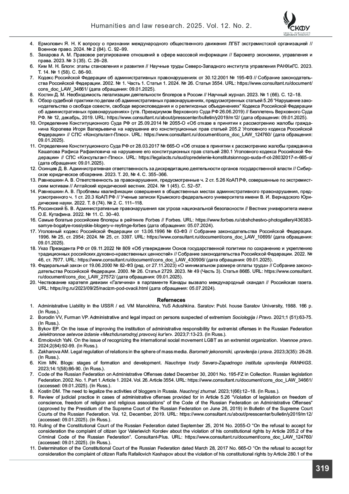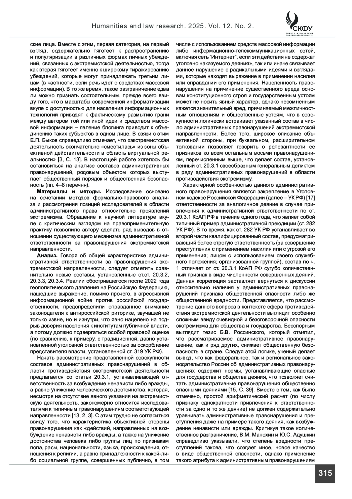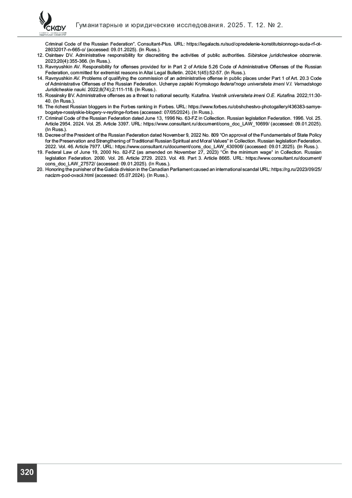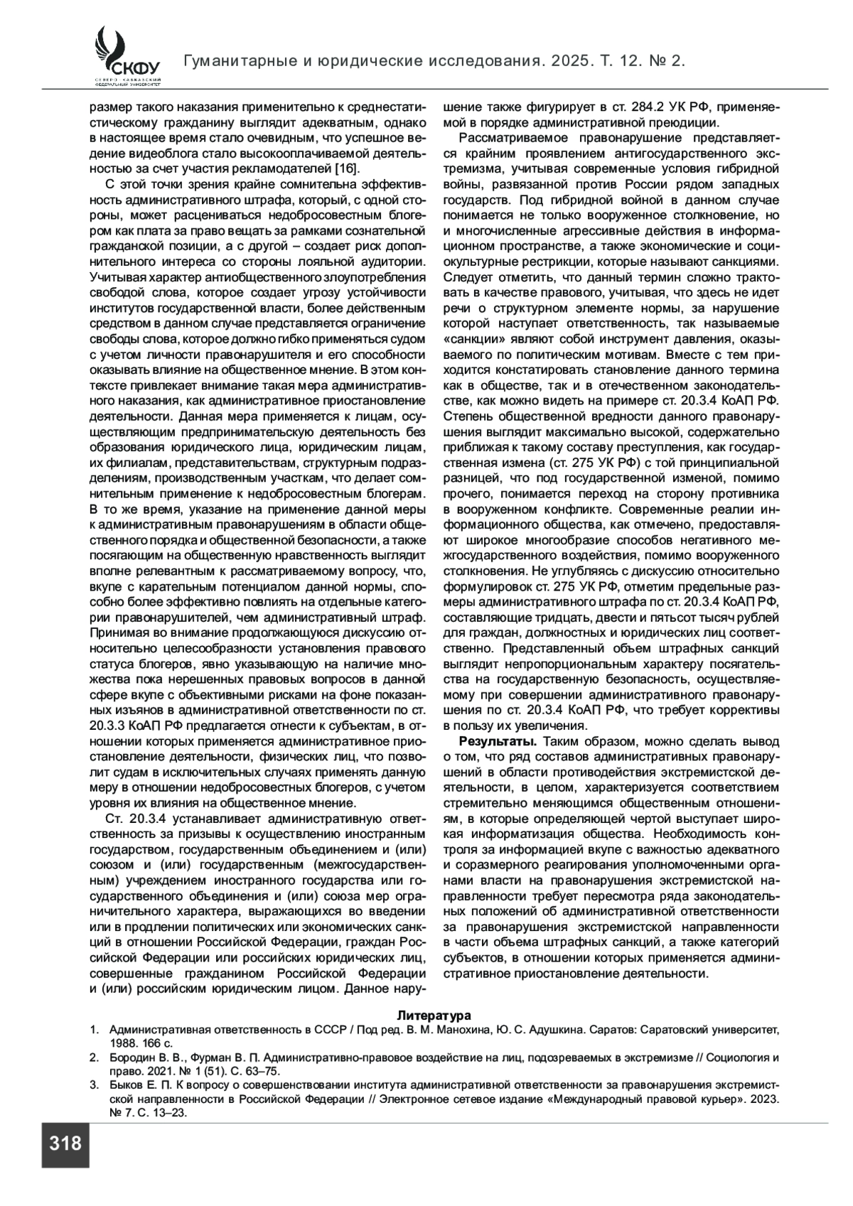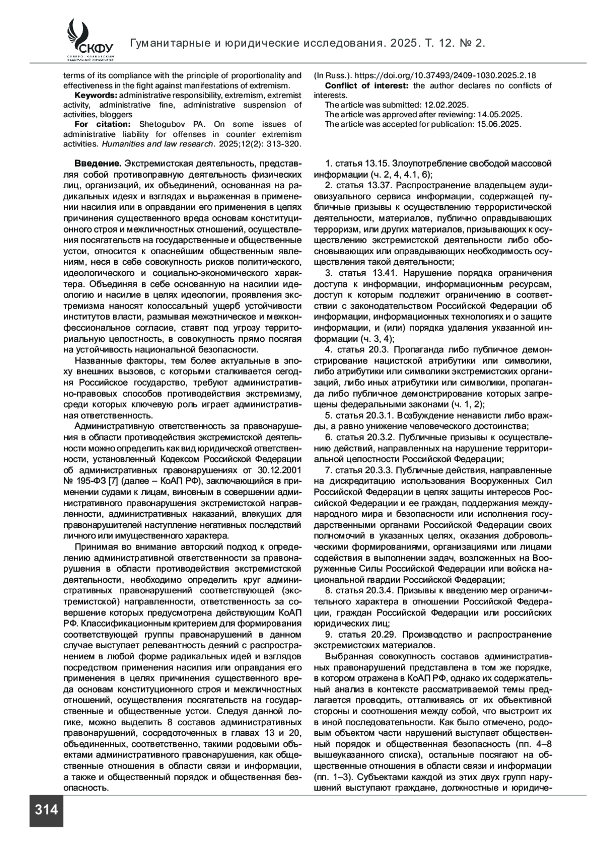 ШЕТОГУБОВ П. А. О НЕКОТОРЫХ ВОПРОСАХ АДМИНИСТРАТИВНОЙ ОТВЕТСТВЕННОСТИ ЗА ПРАВОНАРУШЕНИЯ В ОБЛАСТИ ПРОТИВОДЕЙСТВИЯ ЭКСТРЕМИСТСКОЙ ДЕЯТЕЛЬНОСТИ // ГУМАНИТАРНЫЕ И ЮРИДИЧЕСКИЕ ИССЛЕДОВАНИЯ. 2025. ТОМ 12, № 2