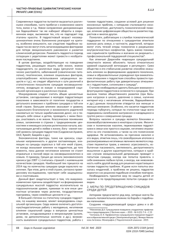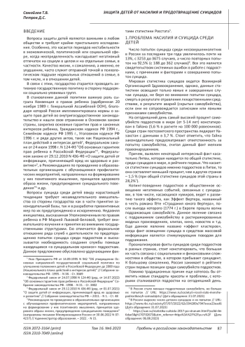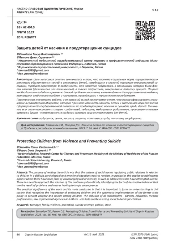 Цель написания статьи заключалась в том, что система социальных норм, осуществляющих регуляцию общественных связей в отношении детей, находящихся в сложной психолого-эмоциональной ситуации, требует пересмотра. В особенности, это касается подростков, в отношении которых были факты насилия (физического или психического), а также подростков, совершавших попытку суицида. Назрела необходимость подойти к решению данной проблемы системно, выявляя факты деструктивного поведения, являющиеся следствием проблем и причинами, приводящими к трагическим последствиям. Практическая значимость работы и ее основной вывод заключается в том, что важно сформировать понимание в гражданском обществе, которое признает важность защиты детей и системного осуществления сформированной государственной политики по предотвращению насилия и суицидов среди детей. Включение всех заинтересованных сторон - родителей, педагогов, медицинских работников, правоохранительных органов и других - может помочь в создании сильного социального оплота для детей.