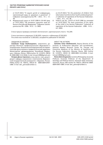 Federal Law No. 436-FZ of 29.12.2010 (as amended on 01.07.2021) “On the protection of children from information harmful to their health and development” // Collection of Legislation of the Russian Federation. - 2011. - N 1. - Art. 48.