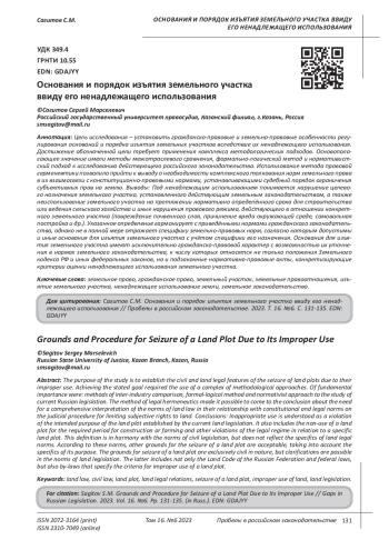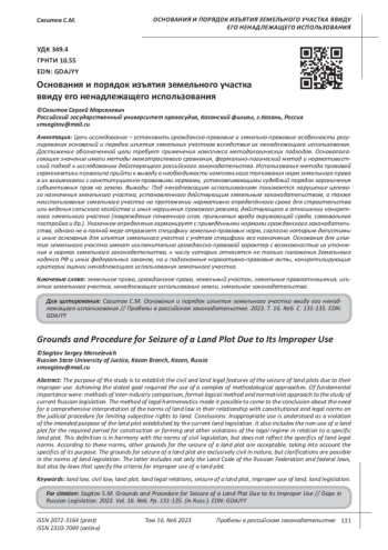 3. 	Батраков Н.К., Трубников Д.А. Проблемы изъятия земельного участка, не используемого по целевому назначению или используемого с нарушением законодательства Российской Федерации // Modern Science. 2019. № 12-3. С. 194-198. EDN: BKOEMI