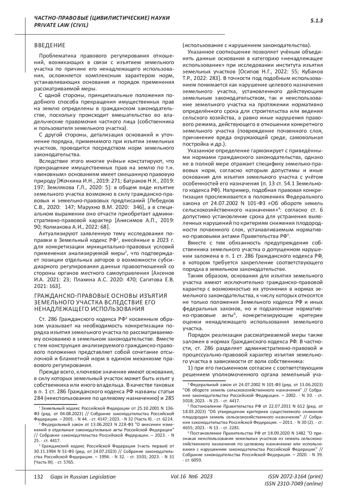 Цель исследования - установить гражданско-правовые и земельно-правовые особенности регулирования оснований и порядка изъятия земельных участков вследствие их ненадлежащего использования. Достижение обозначенной цели требует применения комплекса методологических подходов. Основополагающее значение имели методы межотраслевого сравнения, формально-логический метод и нормативистский подход к исследованию действующего российского законодательства. Использование метода правовой герменевтики позволило прийти к выводу о необходимости комплексного толкования норм земельного права в их взаимосвязи с конституционно-правовыми нормами, устанавливающими судебный порядок ограничения субъективных прав на землю. Выводы: Под ненадлежащим использованием понимается нарушение целевого назначения земельного участка, установленного действующим земельным законодательством, а также неиспользование земельного участка на протяжении нормативно определённого срока для строительства или ведения сельского хозяйства и иные нарушения правового режима, действующего в отношении конкретного земельного участка (повреждение почвенного слоя, причинение вреда окружающей среде, самовольная постройка и др.). Указанное определение гармонирует с приведёнными нормами гражданского законодательства, однако не в полной мере отражает специфику земельно-правовых норм, согласно которым допустимы и иные основания для изъятия земельного участка с учётом специфики его назначения. Основания для изъятия земельного участка имеют исключительно гражданско-правовой характер с возможностью их уточнения в нормах земельного законодательства, к числу которых относятся не только положения Земельного кодекса РФ и иных федеральных законов, но и подзаконные нормативно-правовые акты, конкретизирующие критерии оценки ненадлежащего использования земельного участка.