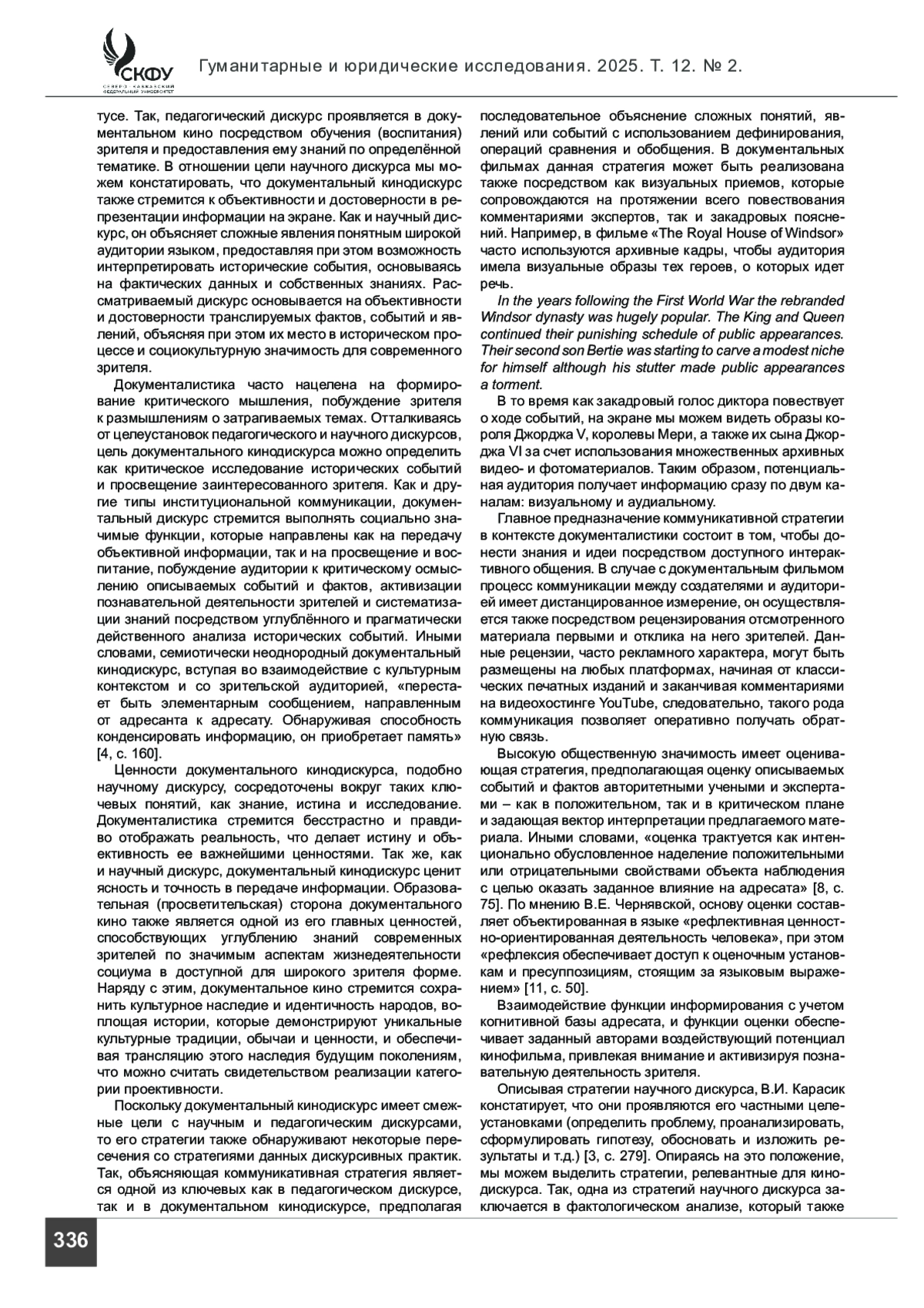 Введение. Данная работа представляет собой комплексное исследование документального кинодискурса как институциональной формы коммуникации. Документальные фильмы играют важную роль в политической и образовательной сферах, выступая в качестве инструмента воздействия и пропаганды благодаря оценочному вектору представления знаковых для общества реальных событий, что обусловливает их особый социокультурный и прагматический потенциал.