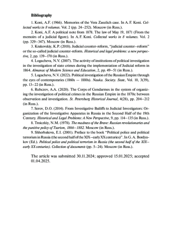 5. 	Логачева Н. В. Политический сыск Российской империи глазами современников (1860-е - 1880-е гг.) // Наука. Общество. Государство. 2022. Т. 10.№ 3 (39). С. 13-22. EDN: CROFKE