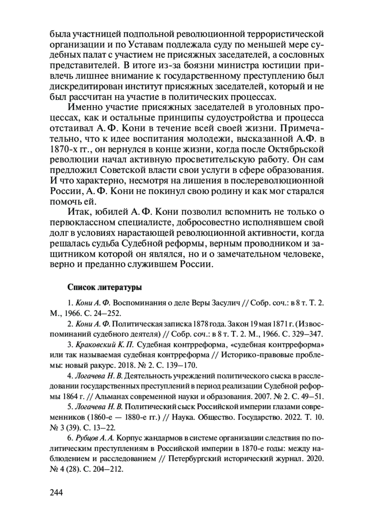1. 	Кони А. Ф. Воспоминания о деле Веры Засулич // Собр. соч.: в 8 т. Т. 2. М., 1966. С. 24-252.