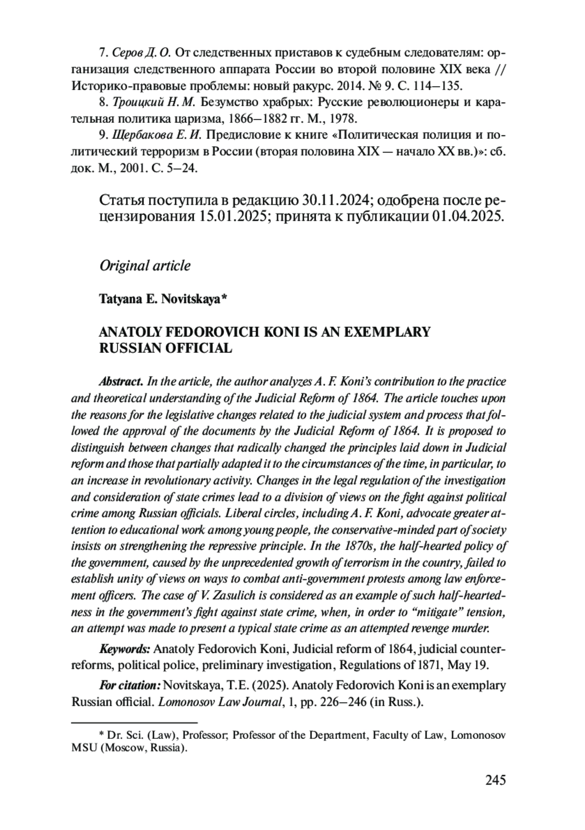 В статье автор анализирует вклад А. Ф. Кони в практику и теоретическое осмысление Судебной реформы 1864 г. В статье затрагиваются причины изменений законодательства, касающихся судоустройства и процесса, последовавших после утверждения документов Судебной реформой 1864 г. Предлагается различать изменения, которые кардинально меняли принципы, заложенные в реформу, и те, которые частично приспосабливали ее к обстоятельствам времени, в частности к повышению революционной активности. Изменения в правовом регулировании расследования и рассмотрения государственных преступлений приводят к разделению взглядов на борьбу с политической преступностью среди российских чиновников. Либеральные круги, в том числе и А. Ф. Кони, выступают за большее внимание к воспитательной работе среди молодежи, консервативно настроенная часть общества настаивает на усилении репрессивного начала. В 1870-е гг. половинчатая политика правительства, вызванная беспрецедентным ростом терроризма в стране, не смогла установить единства взглядов на способы борьбы с антиправительственными выступлениями в среде правоохранителей. Дело В. Засулич рассматривается как пример такой половинчатости в борьбе власти с государственной преступностью, когда в целях «смягчения» напряженности была сделана попытка представить типичное государственное преступление как попытку убийства на почве мести.