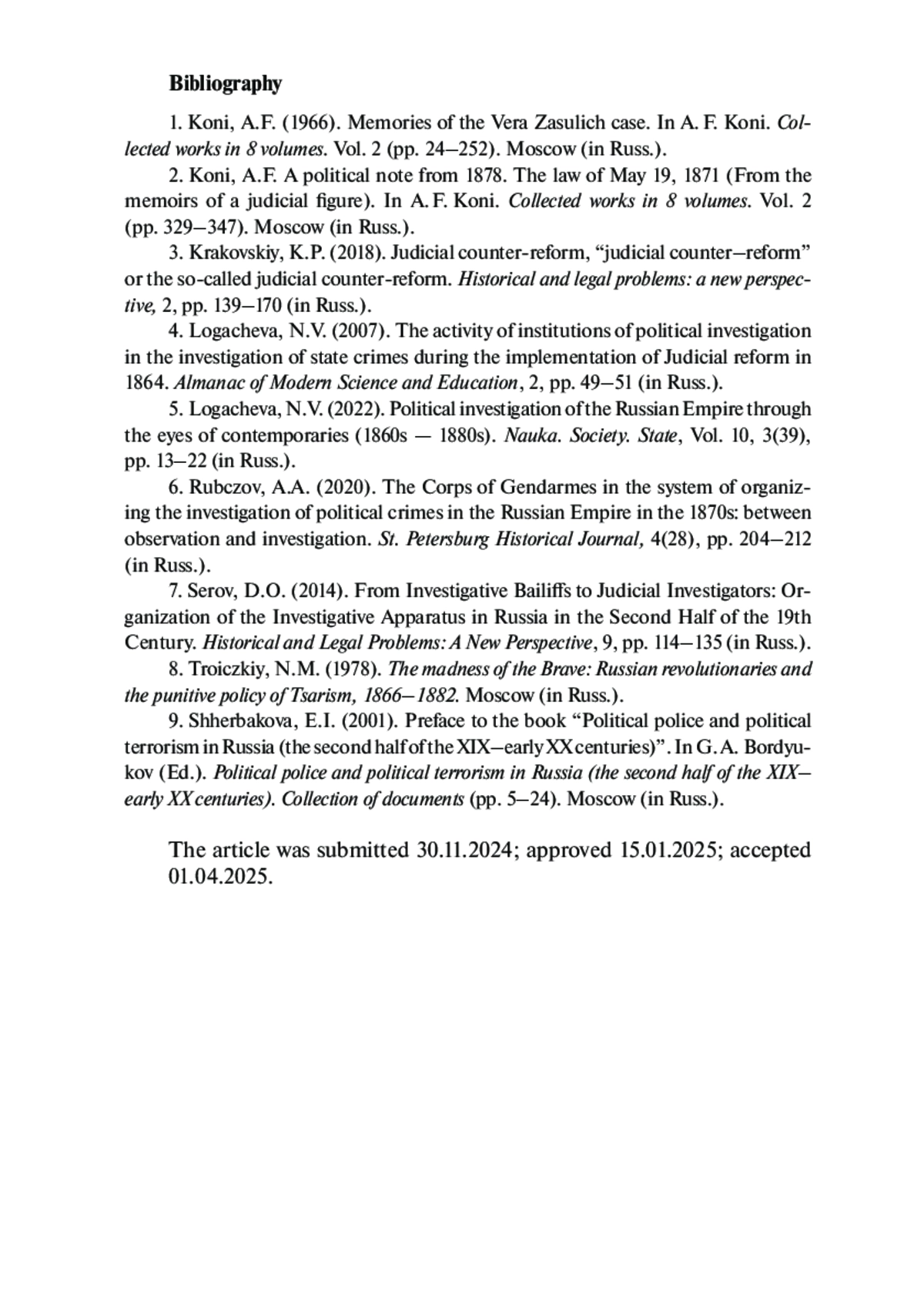 7. 	Серов Д. О. От следственных приставов к судебным следователям: организация следственного аппарата России во второй половине XIX века // Историко-правовые проблемы: новый ракурс. 2014. № 9. С. 114-135. EDN: SQBBUX