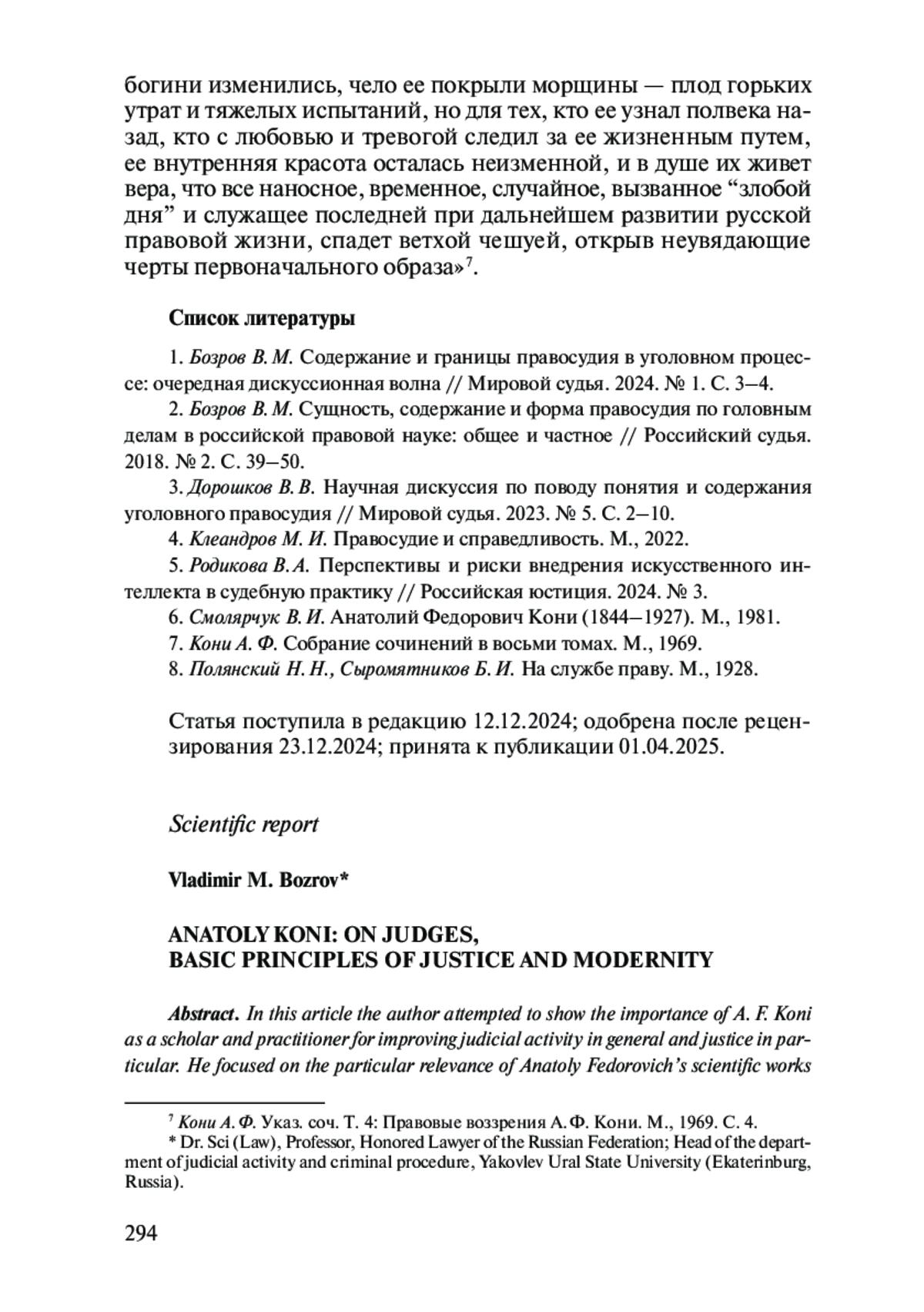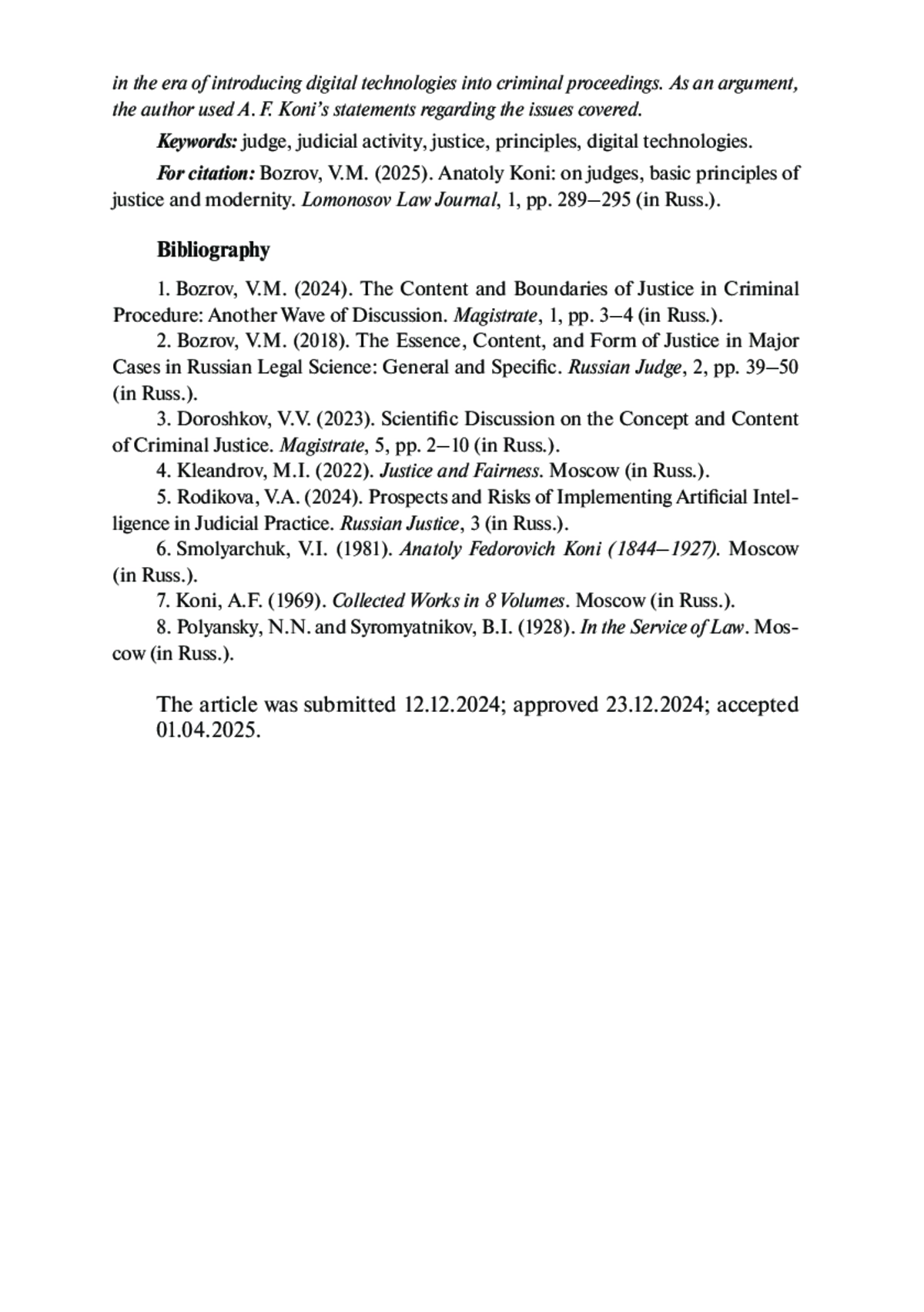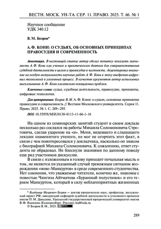 БОЗРОВ В. М. А. Ф. КОНИ: О СУДЬЯХ, ОБ ОСНОВНЫХ ПРИНЦИПАХ ПРАВОСУДИЯ И СОВРЕМЕННОСТЬ // ВЕСТНИК МОСКОВСКОГО УНИВЕРСИТЕТА. СЕРИЯ 11: ПРАВО. 2025. № 1