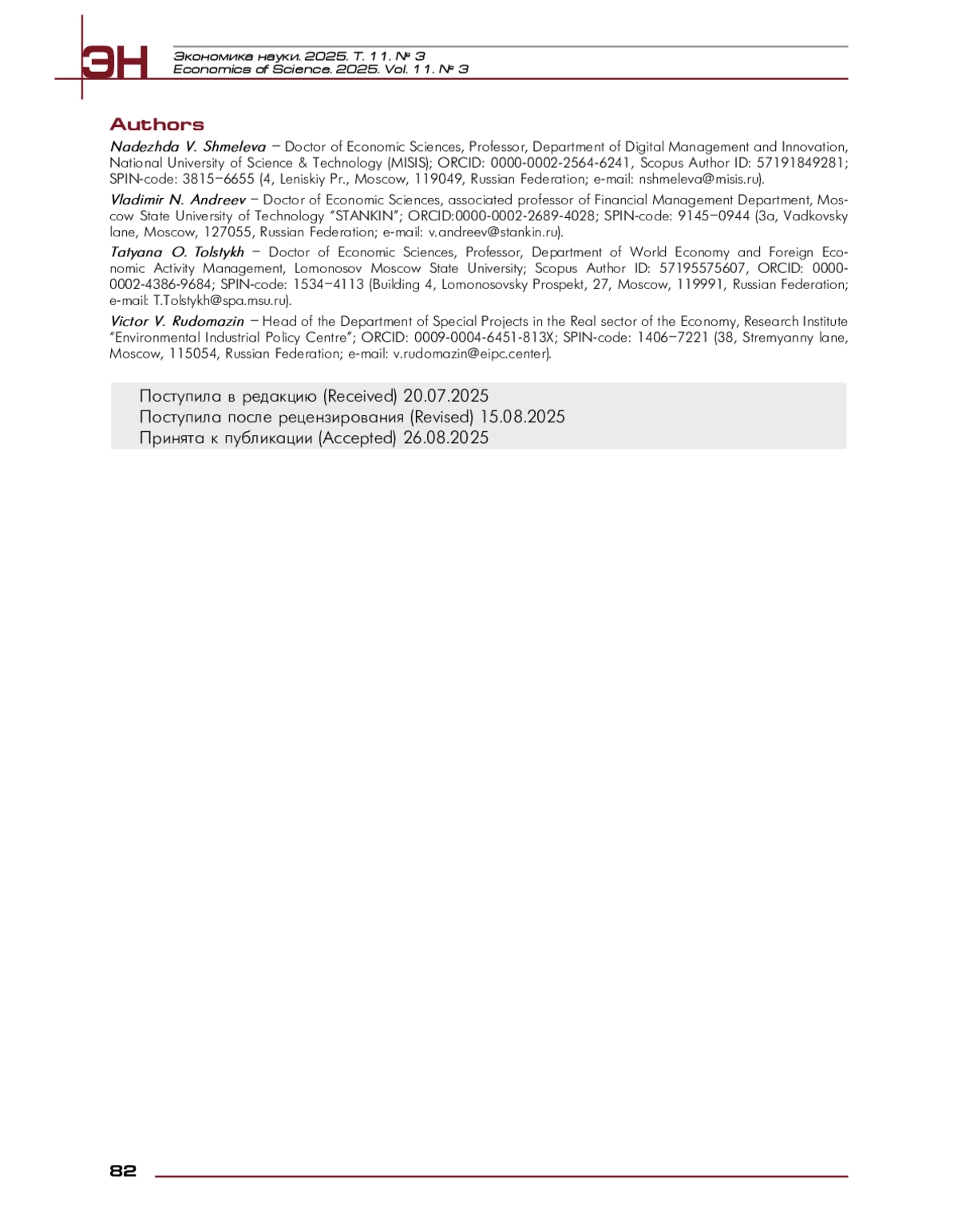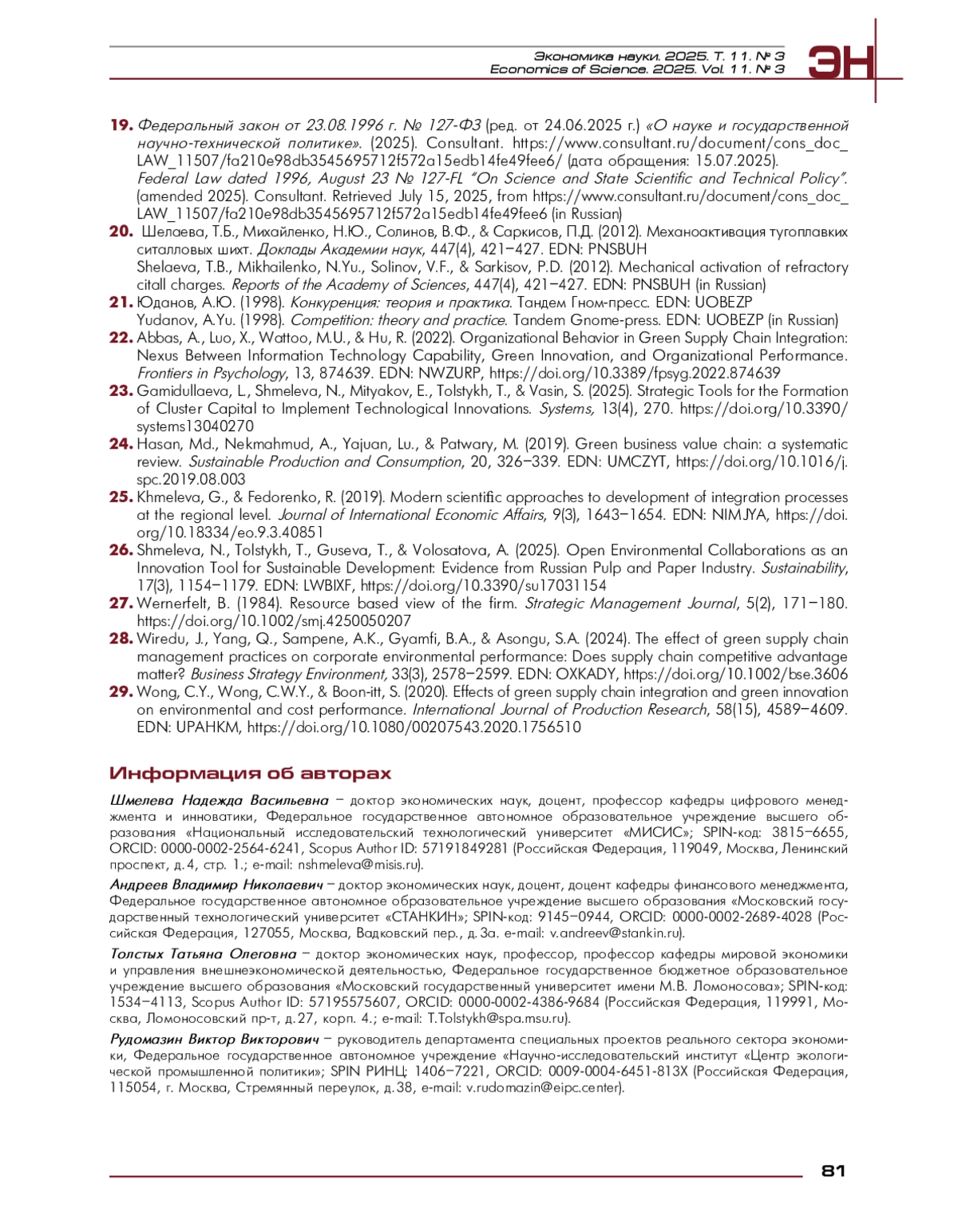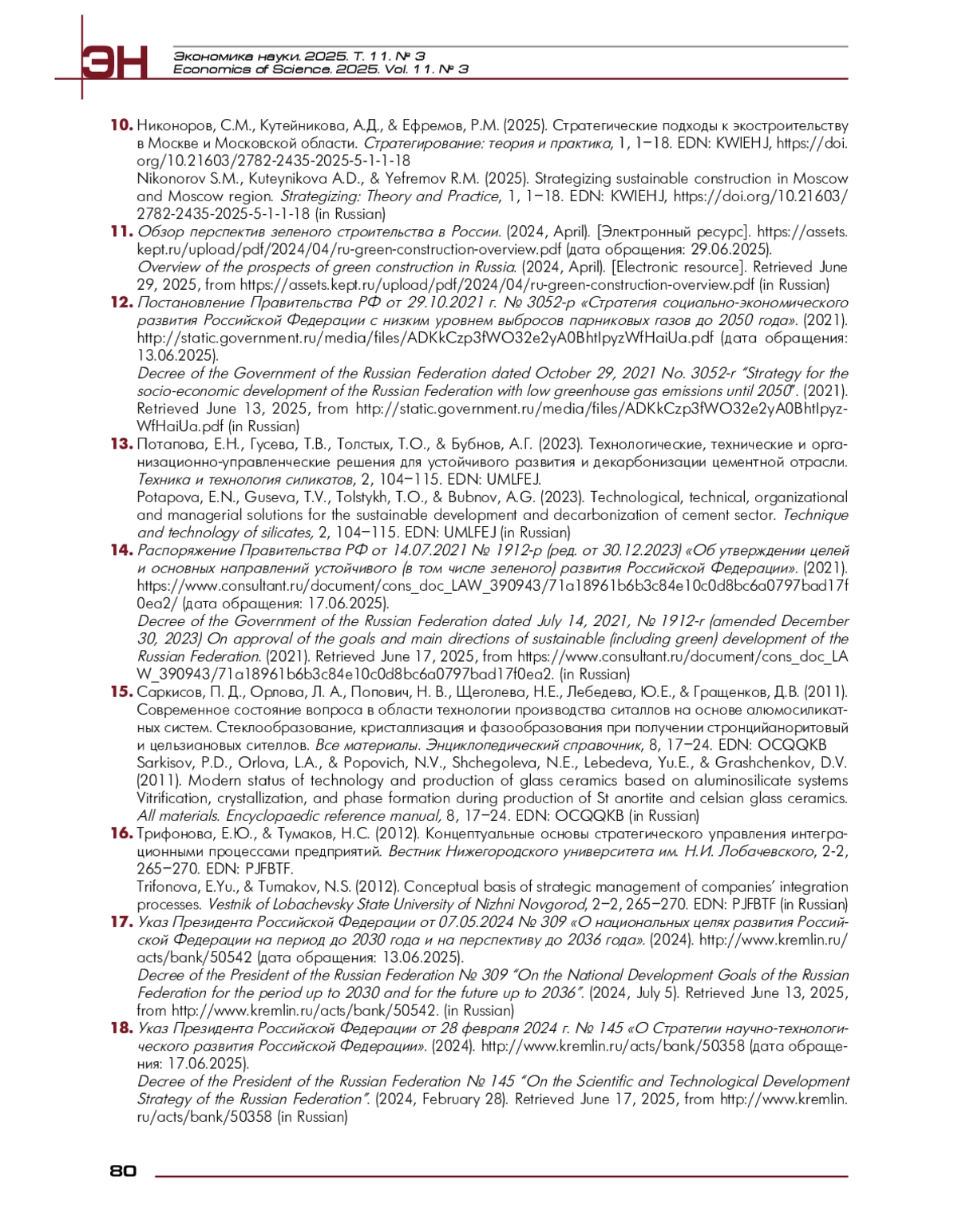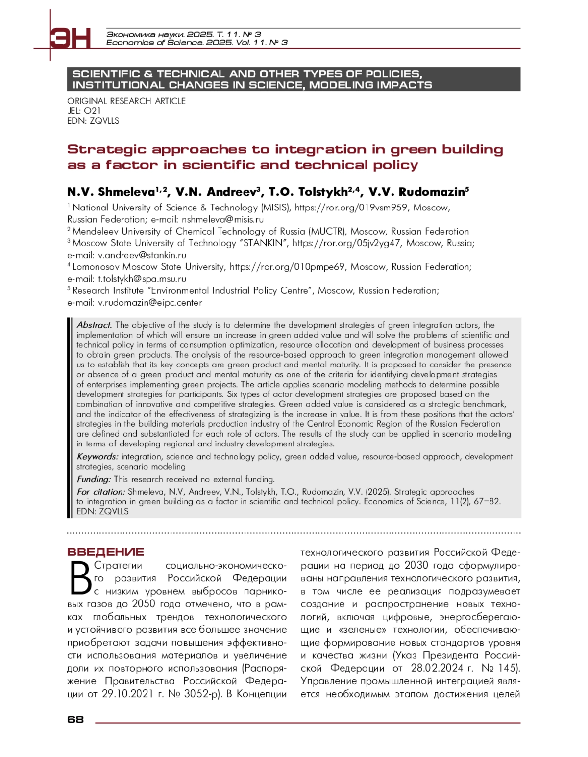 АНДРЕЕВ В. Н., ТОЛСТЫХ Т. О., РУДОМАЗИН В. В. СТРАТЕГИЧЕСКИЕ ПОДХОДЫ К ИНТЕГРАЦИИ В «ЗЕЛЕНОМ» СТРОИТЕЛЬСТВЕ КАК ФАКТОР НАУЧНО-ТЕХНИЧЕСКОЙ ПОЛИТИКИ // ЭКОНОМИКА НАУКИ. 2025. ТОМ 11, № 3
