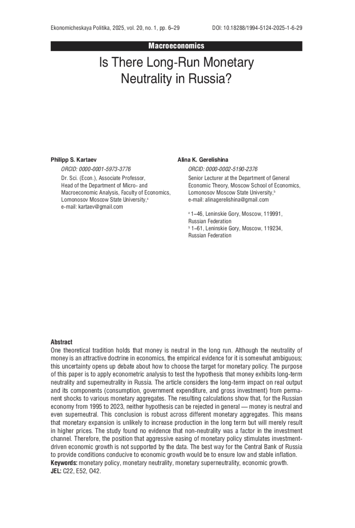 2. Малкина М.Ю., Моисеев И.А. К вопросу об эндогенности предложения денег в российской экономике //Финансы и кредит. 2019. Т. 25. № 10. С. 2266-2280. https://doi.org/10.24891/fc.25.10.2266.