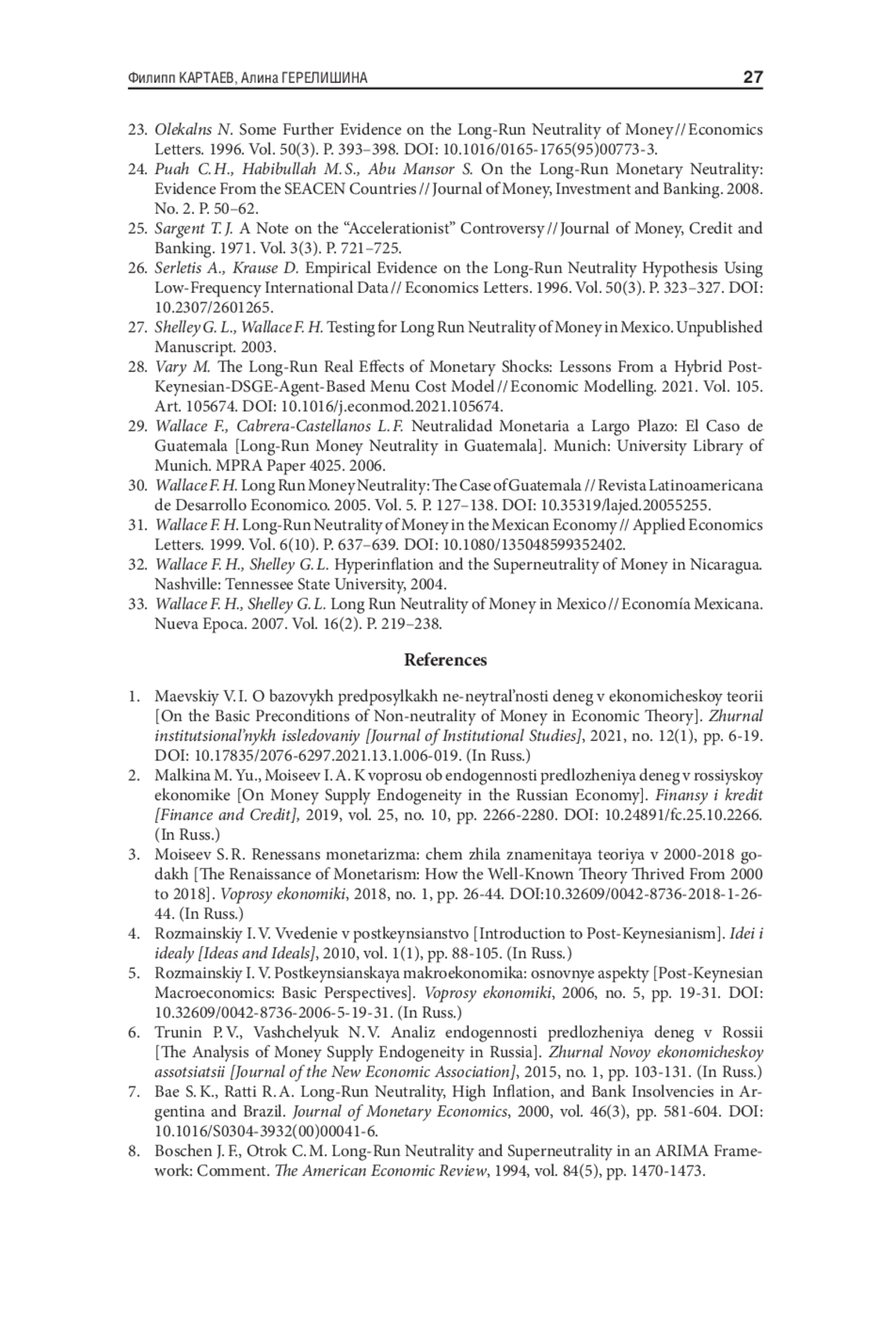 1. Маевский В.И. О базовых предпосылках не-нейтральности денег в экономической теории//Журнал институциональных исследований. 2021. № 13(1). С. 6-19. https://doi.org/10.17835/2076-6297.2021.13.1.006-019.