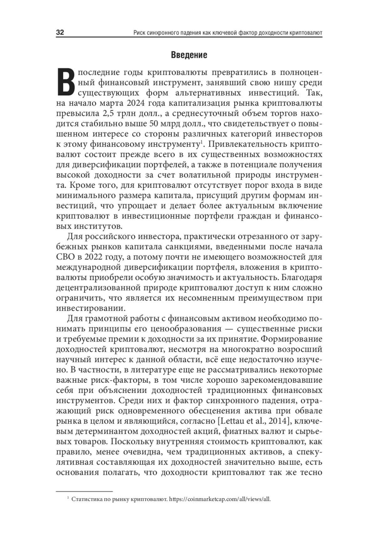 Какую роль в формировании доходности криптовалют играет фактор риска синхронного падения — обесценения отдельных криптовалют и портфелей при падении рынка в целом? Ответу на этот вопрос посвящена настоящая работа. Исследование строится на недельных данных за 2014–2018 годы и охватывает свыше 900 криптовалют. Эмпирическая часть содержит регрессионный анализ, рассматривающий сразу три подхода к измерению систематического риска криптовалют, соответствующих различным положениям криптоактивов в портфелях инвесторов. В рамках этого оцениваются индивидуальные коэффициенты чувствительности криптовалют к рискам, строятся факторные портфели и тестируются портфельные стратегии, проводится кросс-секционный анализ с определением значимых риск-премий — всего более 315 тысяч регрессионных итераций. В результате выявлено, что криптоактивы очень чувствительны к риску обвала на рынке криптовалют, но нечувствительны к происходящему на рынке акций, а также на рынках, относящихся к альтернативным инвестициям, сохраняя свою автономность. Более подверженные риску синхронного падения инструменты в среднем являются более доходными, причем данная закономерность обнаруживается как на уровне отдельных инструментов, так и на уровне крупных портфелей криптовалют и не может быть отнесена к ненаблюдаемым факторам. Усредненная премия за риск синхронного падения составила 1,3% в неделю и оказалась ключевым компонентом доходностей криптовалют. Таким образом, высокие доходности криптоактивов являются лишь компенсацией за соответствующие высокие риски синхронного падения. Одновременно в исследовании подтверждается значимость факторов SMB и WML, отражающих надбавки за риски малой капитализации и высоких прошлых доходностей соответственно, для доходностей криптоактивов и предлагается трехфакторная модель, успешно объясняющая более 50% кросс-секционных доходностей криптовалют, превосходя уже представленные в литературе модели. Полученные результаты могут применяться в рамках дальнейших теоретических исследований, посвященных доходностям криптовалют, и в ходе управления инвестициями в криптовалюты портфельными менеджерами и индивидуальными инвесторами.