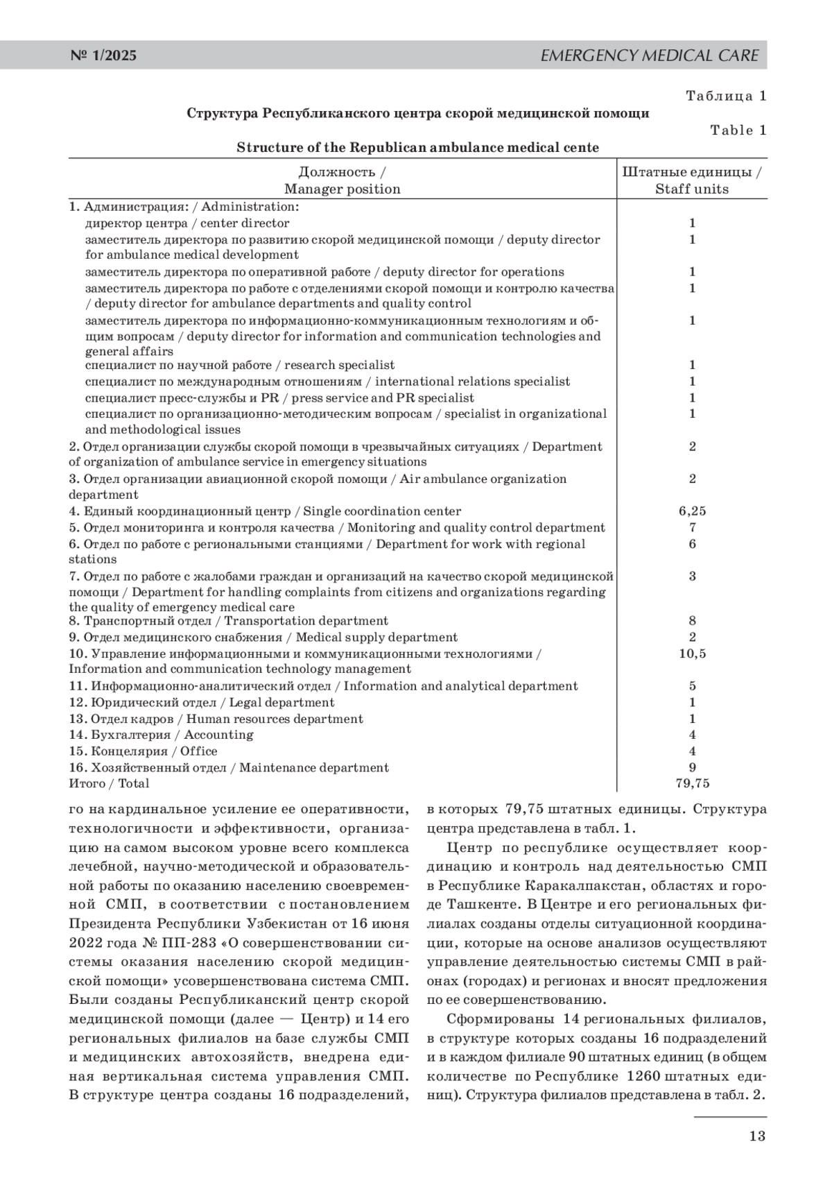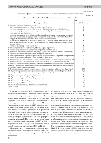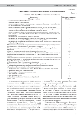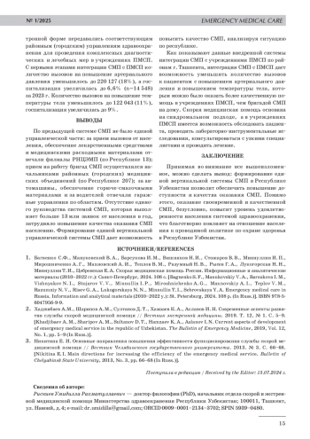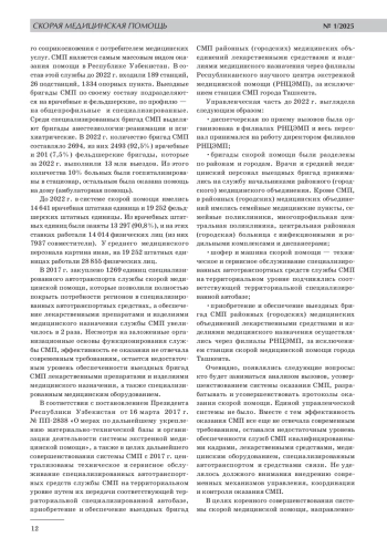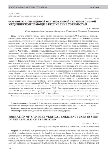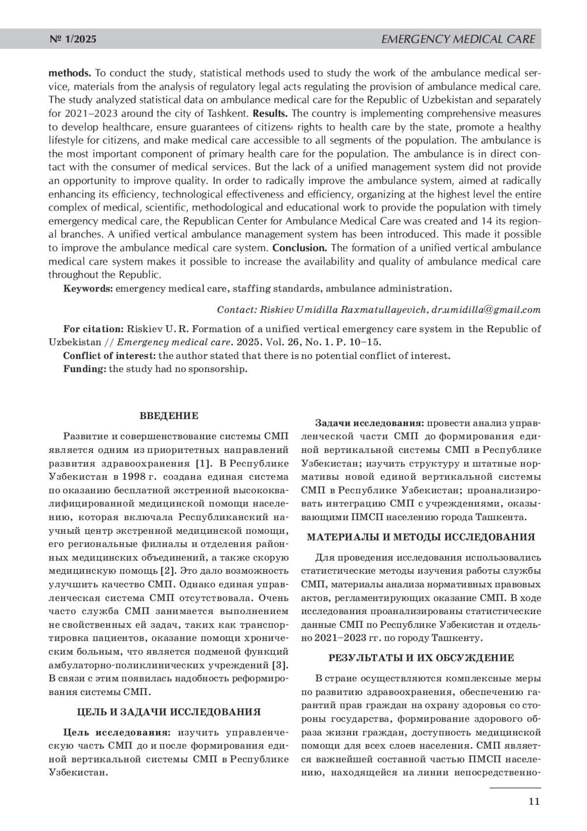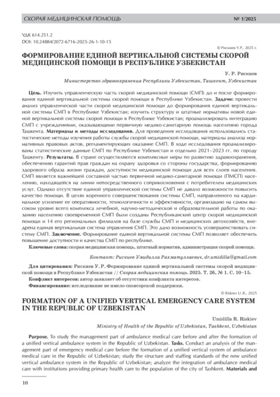 Цель. Изучить управленческую часть скорой медицинской помощи (СМП) до и после формирования единой вертикальной системы скорой помощи в Республике Узбекистан. Задачи: провести анализ управленческой части скорой медицинской помощи до формирования единой вертикальной системы СМП в Республике Узбекистан; изучить структуру и штатные нормативы новой единой вертикальной системы скорой помощи в Республике Узбекистан; проанализировать интеграцию СМП с учреждениями, оказывающими первичную медико-санитарную помощь населению города Ташкента. Материалы и методы исследования. Для проведения исследования использовались статистические методы изучения работы службы скорой медицинской помощи, материалы анализа нормативных правовых актов, регламентирующих оказание СМП. В ходе исследования проанализированы статистические данные СМП по Республике Узбекистан и отдельно 2021–2023 гг. по городу Ташкенту. Результаты. В стране осуществляются комплексные меры по развитию здравоохранения, обеспечению гарантий прав граждан на охрану здоровья со стороны государства, формированию здорового образа жизни граждан, доступности медицинской помощи для всех слоев населения. СМП является важнейшей составной частью первичной медико-санитарной помощи (ПМСП) населению, находящейся на линии непосредственного соприкосновения с потребителем медицинских услуг. Однако отсутствие единой управленческой системы СМП не давало возможности повысить качество помощи. В целях коренного совершенствования системы СМП, направленного на кардинальное усиление ее оперативности, технологичности и эффективности, организацию на самом высоком уровне всего комплекса лечебной, научно-методической и образовательной работы по оказанию населению своевременной СМП были созданы Республиканский центр скорой медицинской помощи и 14 его региональных филиалов на базе службы СМП и медицинских автохозяйств, внедрена единая вертикальная система управления СМП. Это дало возможность усовершенствовать систему СМП. Заключение. Формирование единой вертикальной системы СМП позволяет обеспечить повышение доступности и качества СМП по республике.