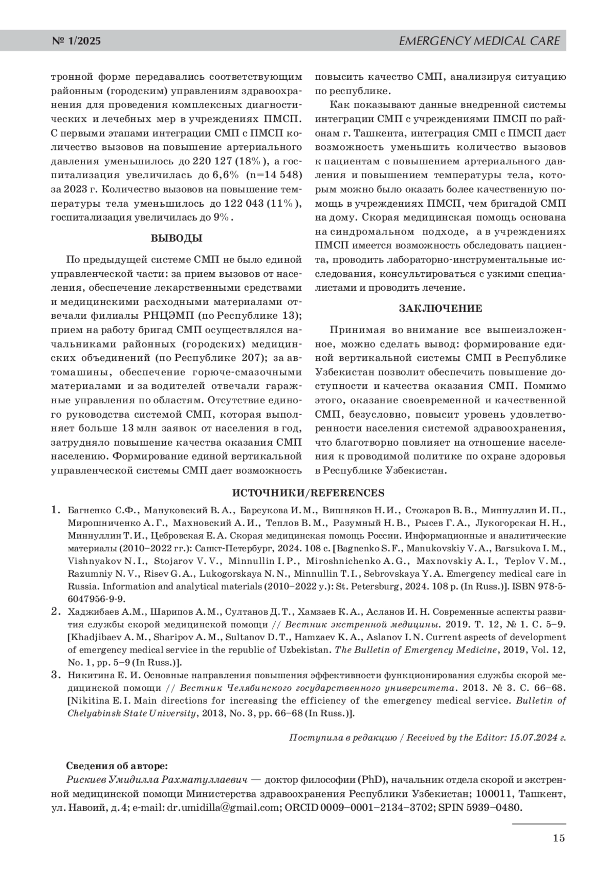 2. 	Хаджибаев А.М., Шарипов А. М., Султанов Д. Т., Хамзаев К. А., Асланов И. Н. Современные аспекты развития службы скорой медицинской помощи // Вестник экстренной медицины. 2019. Т. 12, № 1. С. 5-9.