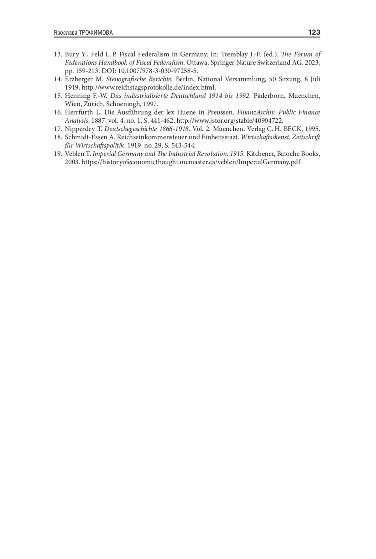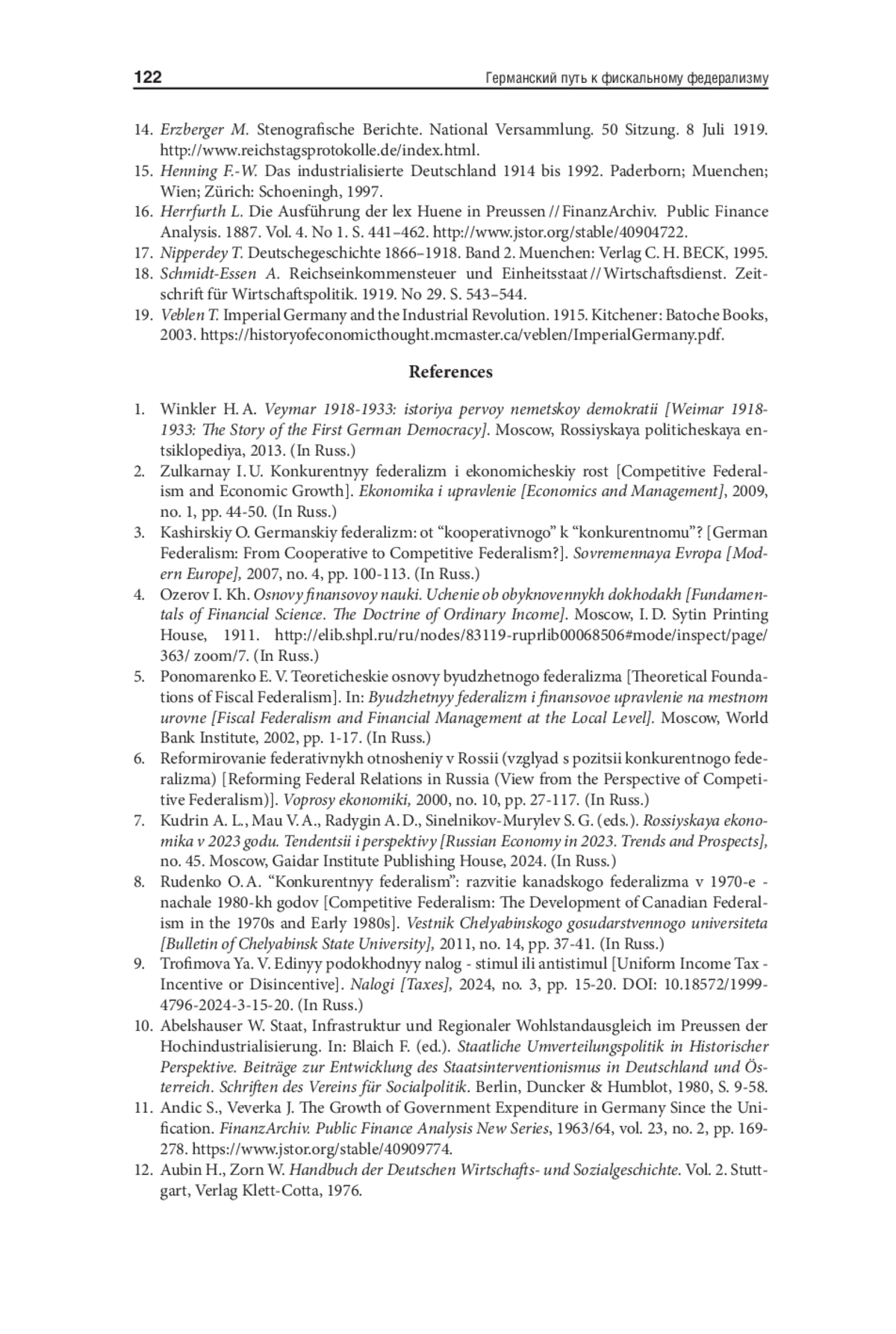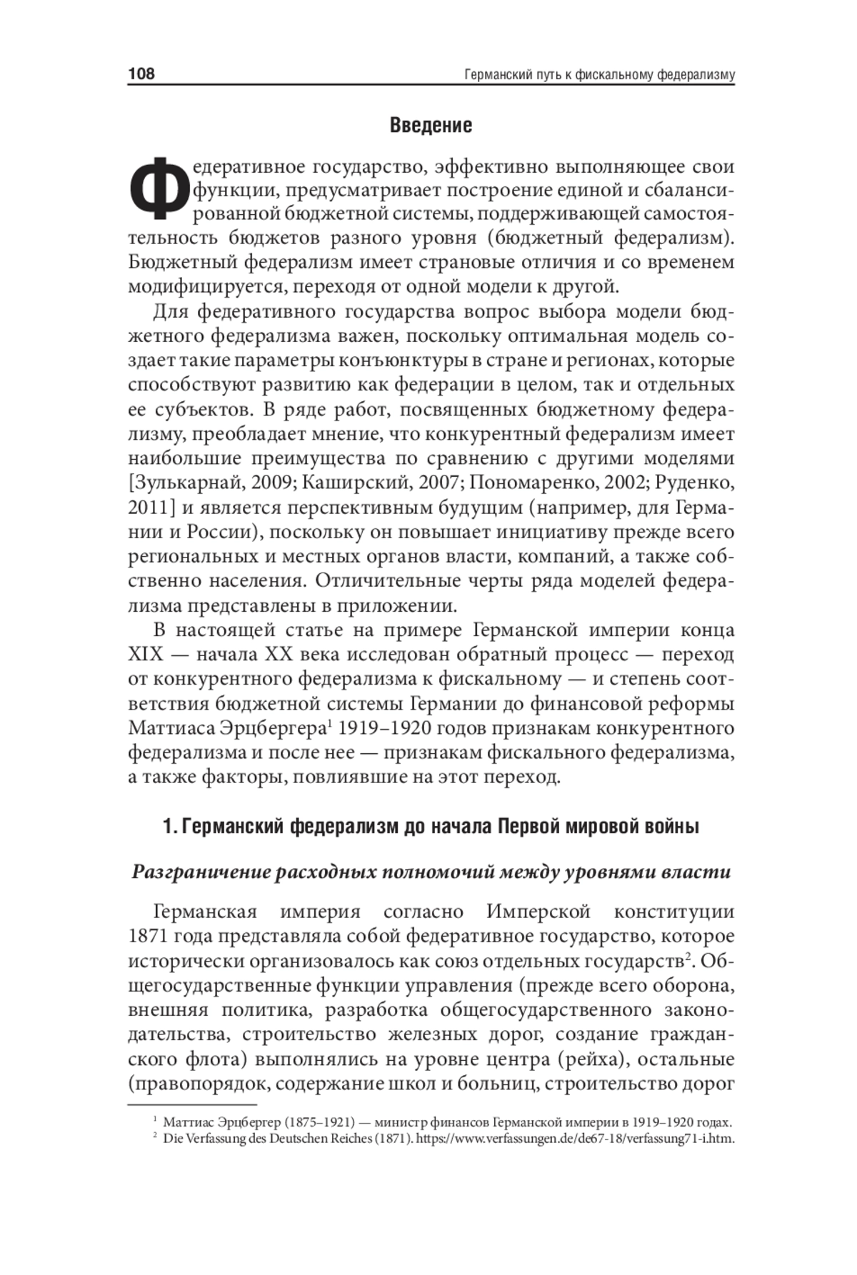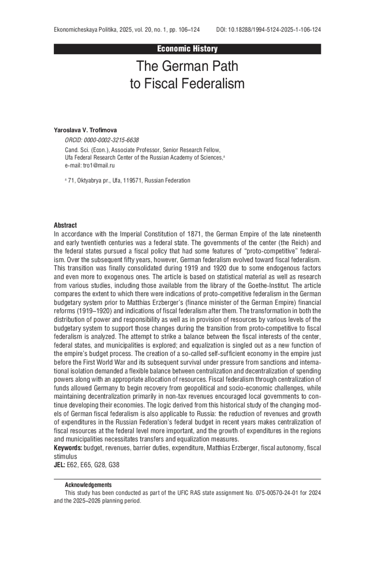 Германская империя конца XIX — начала XX века представляла собой, согласно Имперской конституции 1871 года, федеративное государство. Правительства центра (рейха) и федеральных земель проводили финансово-бюджетную политику, которая соответствовала чертам «протоконкурентного» федерализма. Однако в течение последующих пятидесяти лет германский федерализм эволюционировал в сторону фискального федерализма. Под действием эндогенных и прежде всего экзогенных факторов этот переход окончательно завершился к 1919–1920 годам. В статье на основе статистического материала, а также разных исследований, в том числе представленных в библиотеке Института имени Гете, оценена степень соответствия бюджетной системы Германии до финансовой реформы 1919–1920, осуществленной министром финансов Германской империи Маттиасом Эрцбергером, признакам «протоконкурентного» федерализма и после нее — фискального федерализма. Проанализирована трансформация распределения властных полномочий, ответственности и их ресурсного обеспечения по уровням бюджетной системы при переходе от «протоконкурентного» федерализма к фискальному. Исследована попытка достижения баланса фискальных интересов центра, федеральных земель и муниципалитетов. Выделена новая функция бюджета империи — выравнивание. Установлено, что создание в империи непосредственно перед войной так называемой самодостаточной экономики и последующее выживание при санкционном давлении и международной изоляции требовали гибкого баланса между централизацией и децентрализацией расходных полномочий, а также соответствующего соотношения ресурсов. Фискальный федерализм в силу централизации средств позволил Германии приступить к преодолению геополитических и социально-экономических вызовов, а сохранение децентрализации прежде всего неналоговых доходов стимулировало местные власти продолжить развивать свою экономику. Логика исследования исторической картины смены моделей бюджетного федерализма в Германии актуальна и для России: сокращение доходов и рост расходов федерального бюджета РФ в последние годы усиливают значение централизации фискальных ресурсов на федеральном уровне, а рост расходов регионов и муниципалитетов — повышают значимость трансфертов и механизма выравнивания.