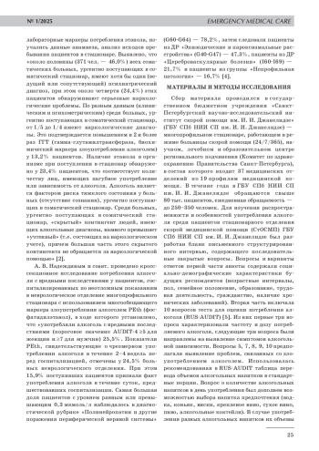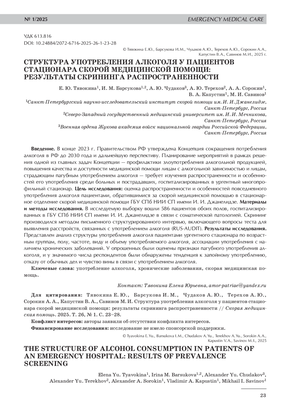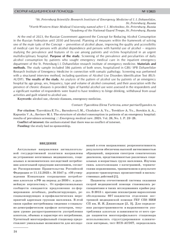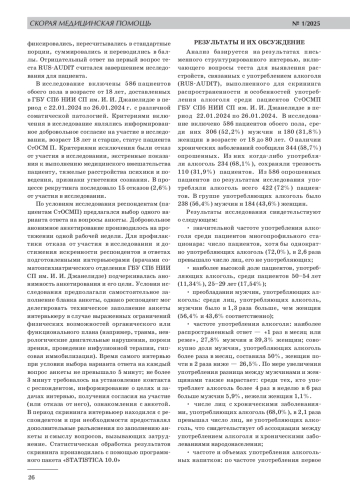 В конце 2023 г. Правительством РФ утверждена Концепция сокращения потребления алкоголя в РФ до 2030 года и дальнейшую перспективу. Планирование мероприятий в рамках решения одной из главных задач Концепции — профилактики злоупотребления алкогольной продукцией, повышения качества и доступности медицинской помощи лицам с алкогольной зависимостью и лицам, страдающим пагубным употреблением алкоголя — требует изучения распространенности и особенностей его употребления среди больных и пострадавших, госпитализированных в ургентный многопрофильный стационар. Цель исследования: оценка распространенности и особенностей повседневного употребления алкоголя пациентами, обратившимися за скорой медицинской помощью в стационарное отделение скорой медицинской помощи ГБУ СПб НИИ СП имени И. И. Джанелидзе. Материалы и методы исследования. В исследуемую выборку вошли 586 пациентов обоих полов, госпитализированных в ГБУ СПб НИИ СП имени И. И. Джанелидзе в связи с соматической патологией. Скрининг производился методом письменного структурированного интервью, включающего вопросы теста для выявления расстройств, связанных с употреблением алкоголя (RUS-AUDIT). Результаты исследования. Представлен анализ структуры употребления алкоголя пациентами ургентного стационара по возрастным группам, полу, частоте, виду и объему употребляемого алкоголя, ассоциации употребления с наличием хронических заболеваний. У опрошенных были оценены признаки пагубного употребления алкоголя, и у значимого числа респондентов были обнаружены тенденция к запойному употреблению, отказу от обычных дел и чувство вины в связи с употреблением алкоголя.
