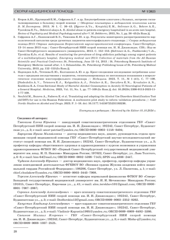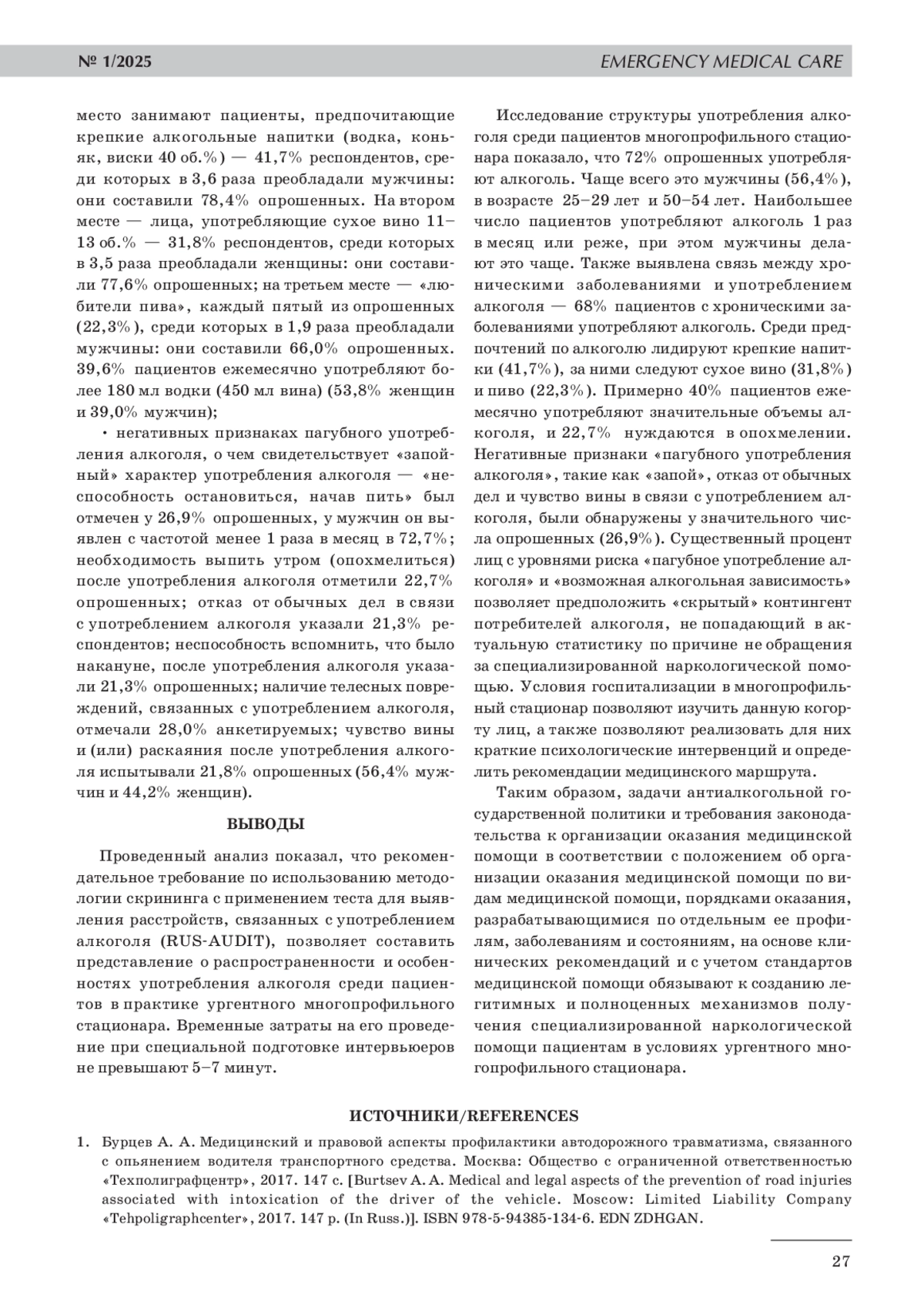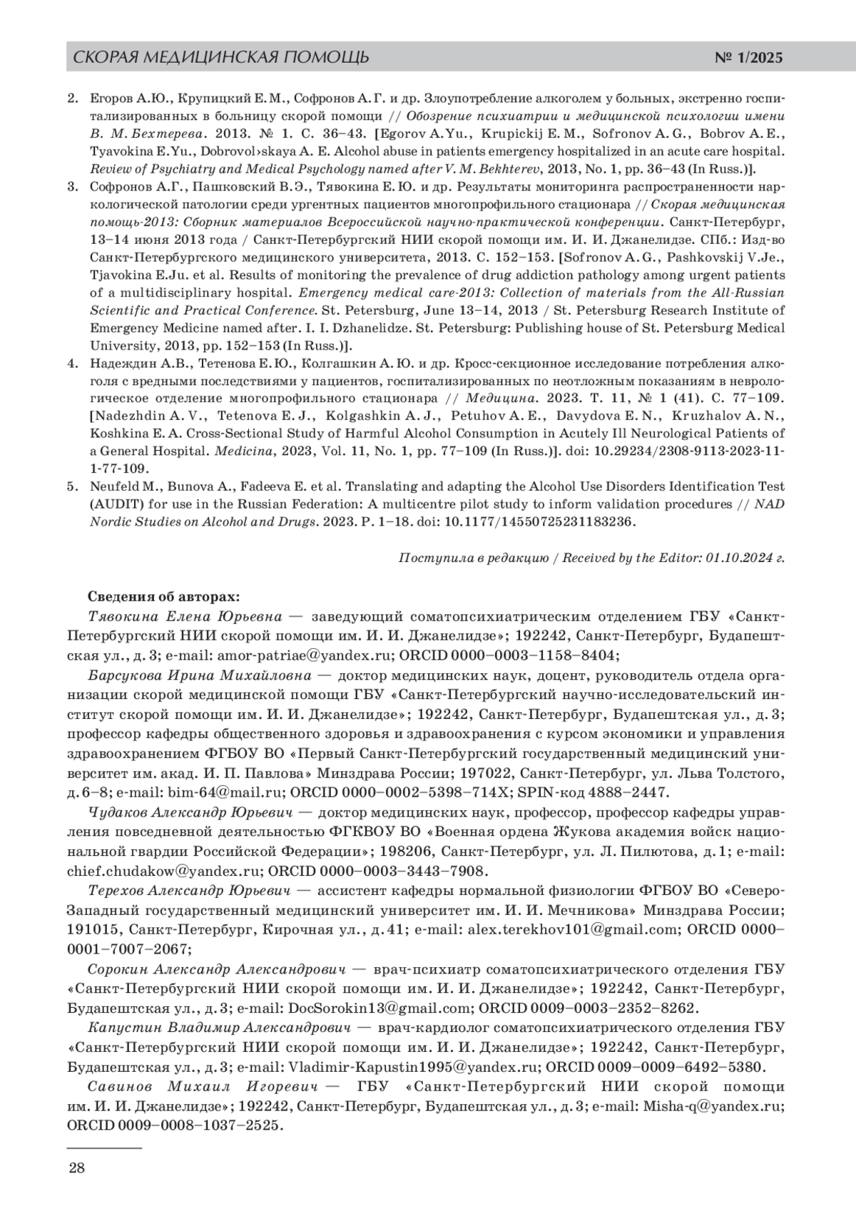 2. 	Егоров А.Ю., Крупицкий Е. М., Софронов А. Г. и др. Злоупотребление алкоголем у больных, экстренно госпитализированных в больницу скорой помощи // Обозрение психиатрии и медицинской психологии имени В. М. Бехтерева. 2013. № 1. С. 36-43.