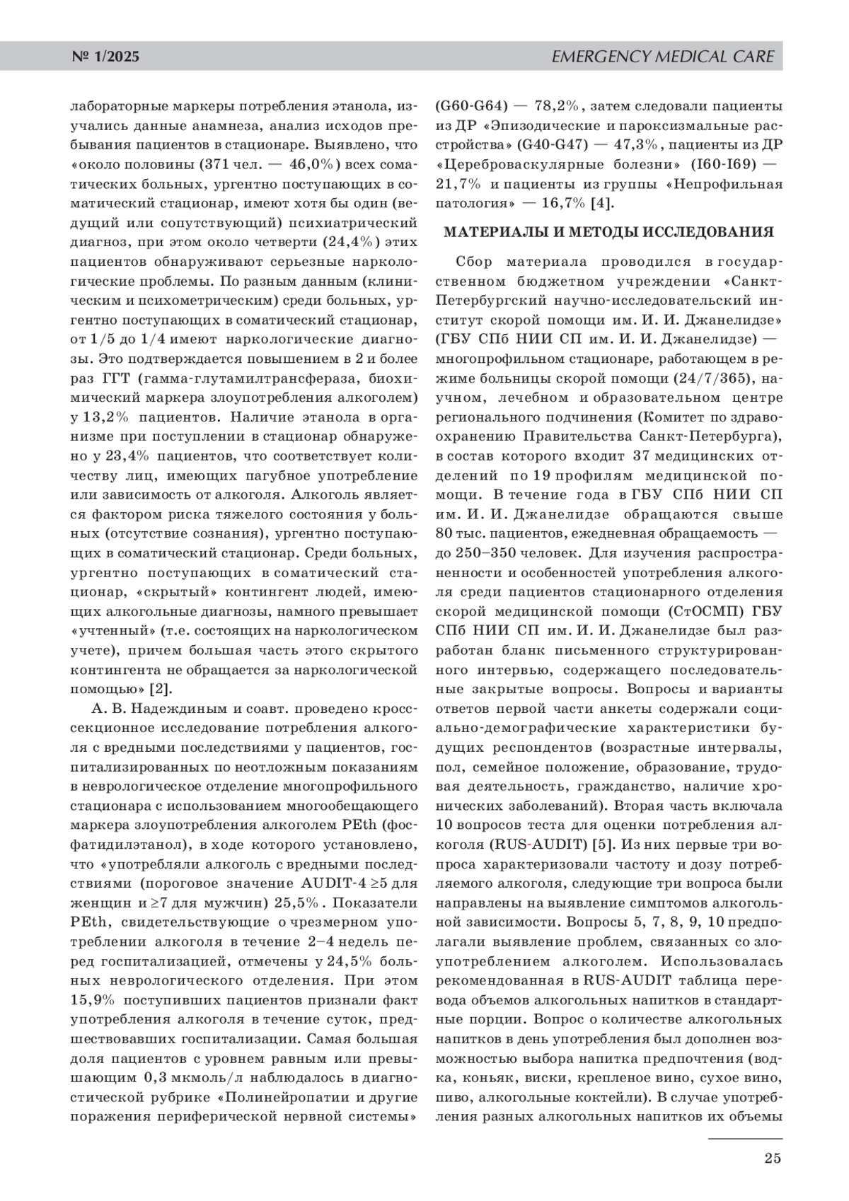 4. 	Надеждин А.В., Тетенова Е. Ю., Колгашкин А. Ю. и др. Кросс-секционное исследование потребления алкоголя с вредными последствиями у пациентов, госпитализированных по неотложным показаниям в неврологическое отделение многопрофильного стационара // Медицина. 2023. Т. 11, № 1 (41). С. 77-109.