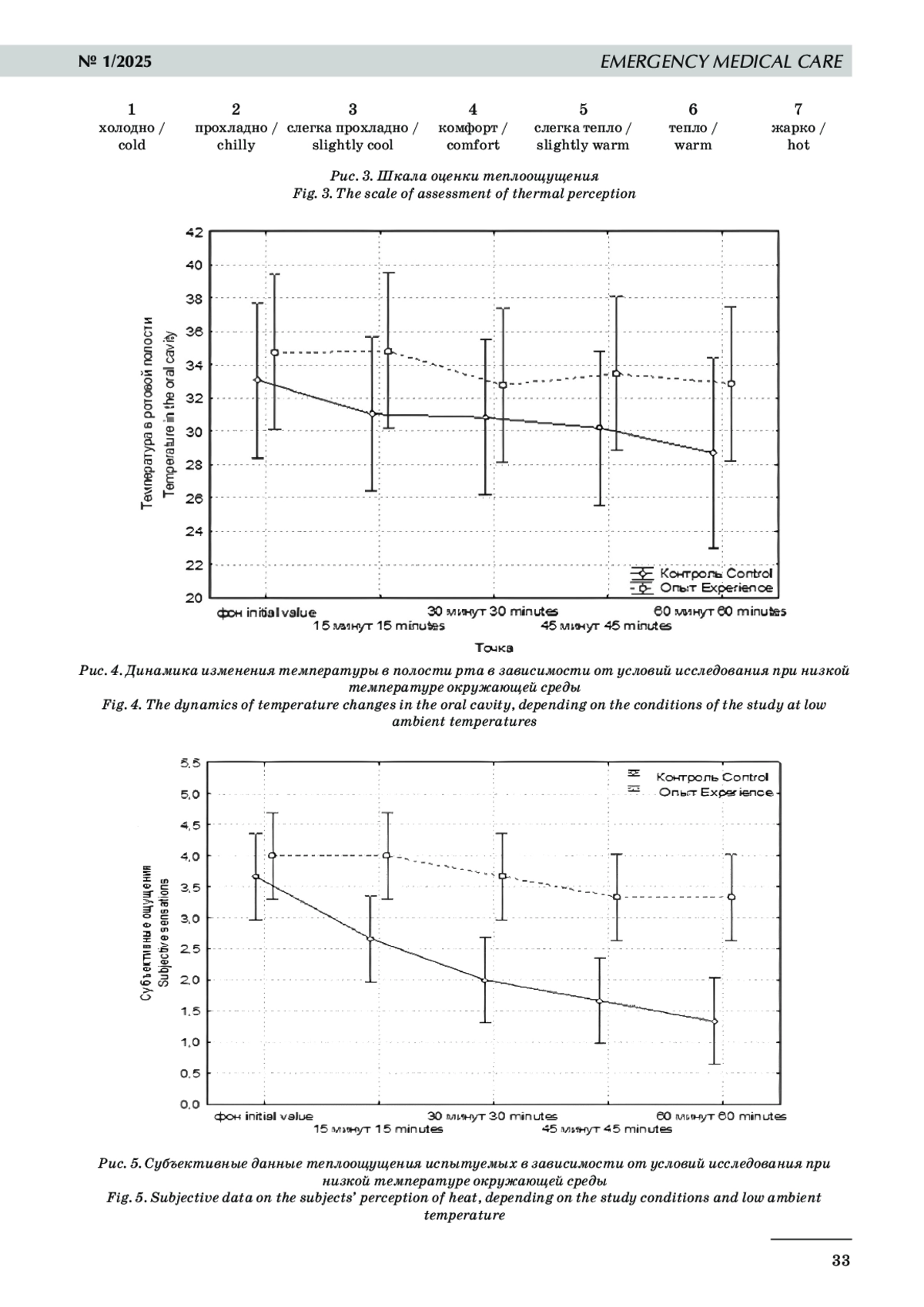 Профилактика гипотермии у раненых и пострадавших остается актуальной проблемой при оказании помощи раненым и пострадавшим с политравмой. Цель исследования: в эксперименте с участием добровольцев оценить эффективность и безопасность применения термопокрывала, предназначенного для предотвращения переохлаждения пострадавшего. Материалы и методы исследования. Исследование выполнялось с участием добровольцев, которые подвергались воздействию холодной температуры с использованием и без использования термоодеяла. Испытуемые находились неподвижно лежа на носилках в термокамере в течение 60 минут при температуре окружающей среды 0 °C, влажность воздуха составляла 50%. Датчики температуры располагались на коже, на верхнем слое одежды и на поверхности термопокрывала. Результаты. Использование термопокрывал при отрицательных температурах окружающей среды способствует более медленному охлаждению организма вследствие отражения тепла от внутренней поверхности изделия. Субъективные ощущения добровольцев показали статистически значимые отличия в теплоощущении при использовании термопокрывал. В опытной группе добровольцы не отмечали, что на каком‑либо этапе им было «холодно», в группе контроля спустя 45 минут наблюдения в 4 случаях ставили 1 балл («холодно»), а один из добровольцев пожелал прекратить исследование. При этом термопокрывала способствуют более медленному остыванию тела. В группе с использованием термопокрывала температура ядра (датчик установлен в ротовой полости) была в среднем выше на 4,2 °C в сравнении с группой добровольцев без термопокрывала. Таким образом, термпопокрывала могут способствовать профилактике гипотермии пострадавших в ходе эвакуации бригадами скорой медицинской помощи. Заключение: представленные образцы изделия термопокрывала являются эффективными средствами профилактики переохлаждения человека в условиях низких температур окружающей среды.