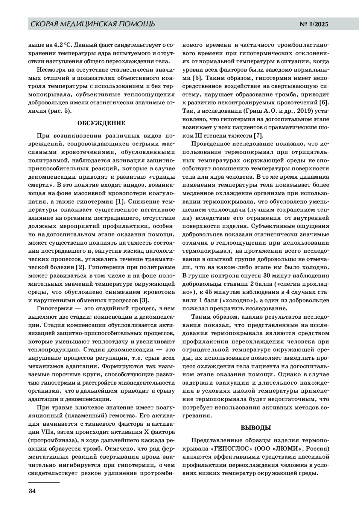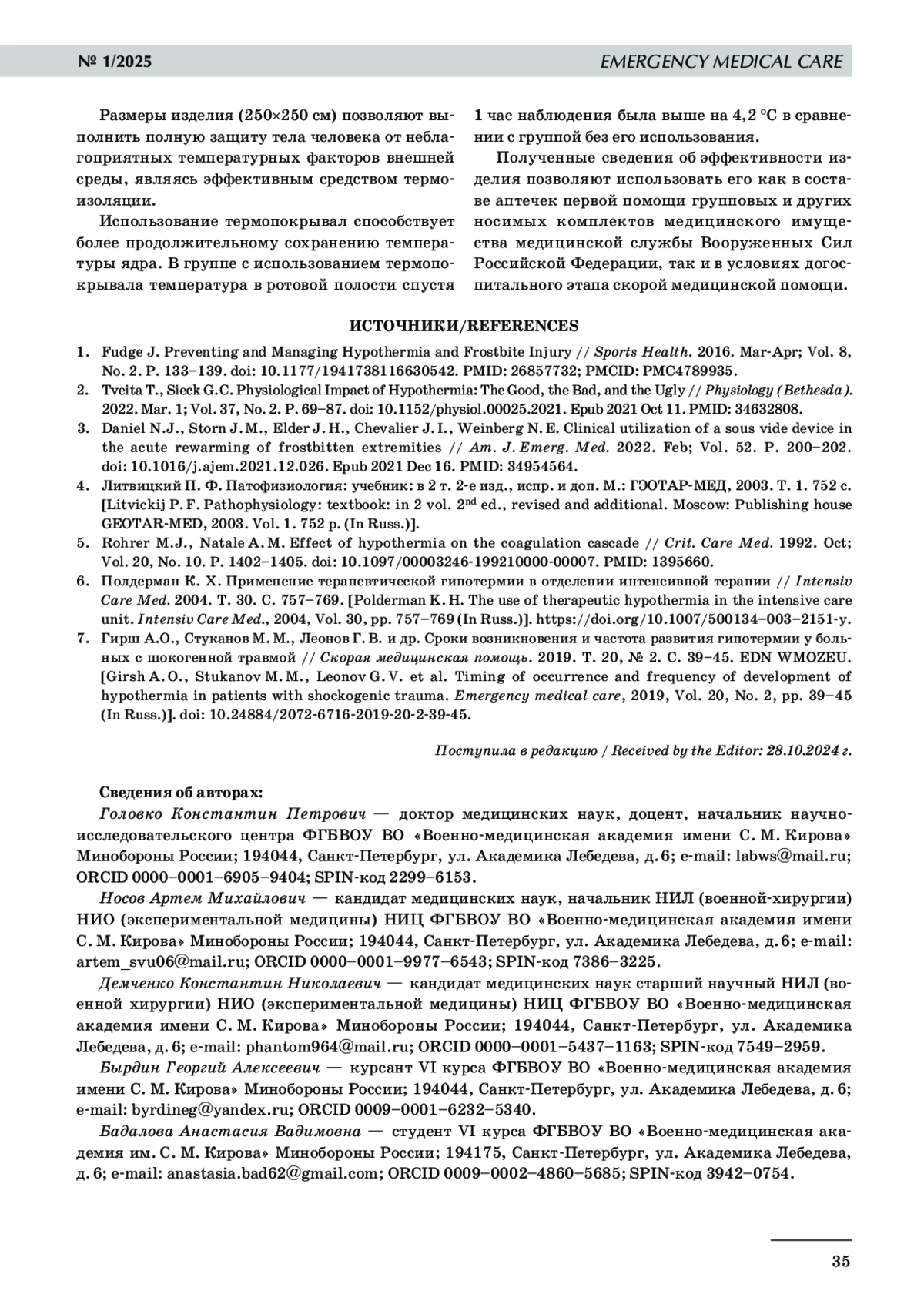 7. 	Гирш А.О., Стуканов М. М., Леонов Г. В. и др. Сроки возникновения и частота развития гипотермии у больных с шокогенной травмой // Скорая медицинская помощь. 2019. Т. 20, № 2. С. 39-45.