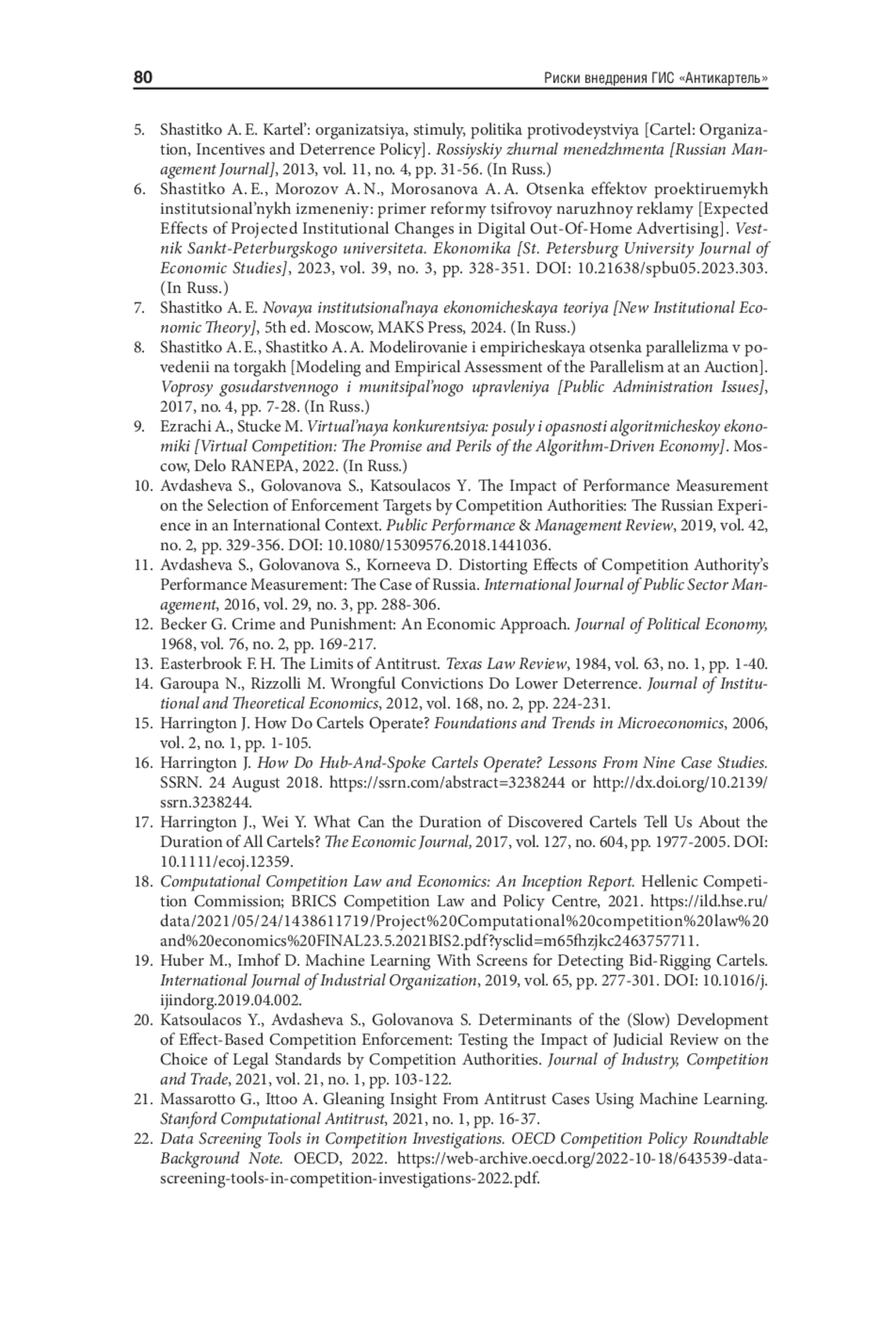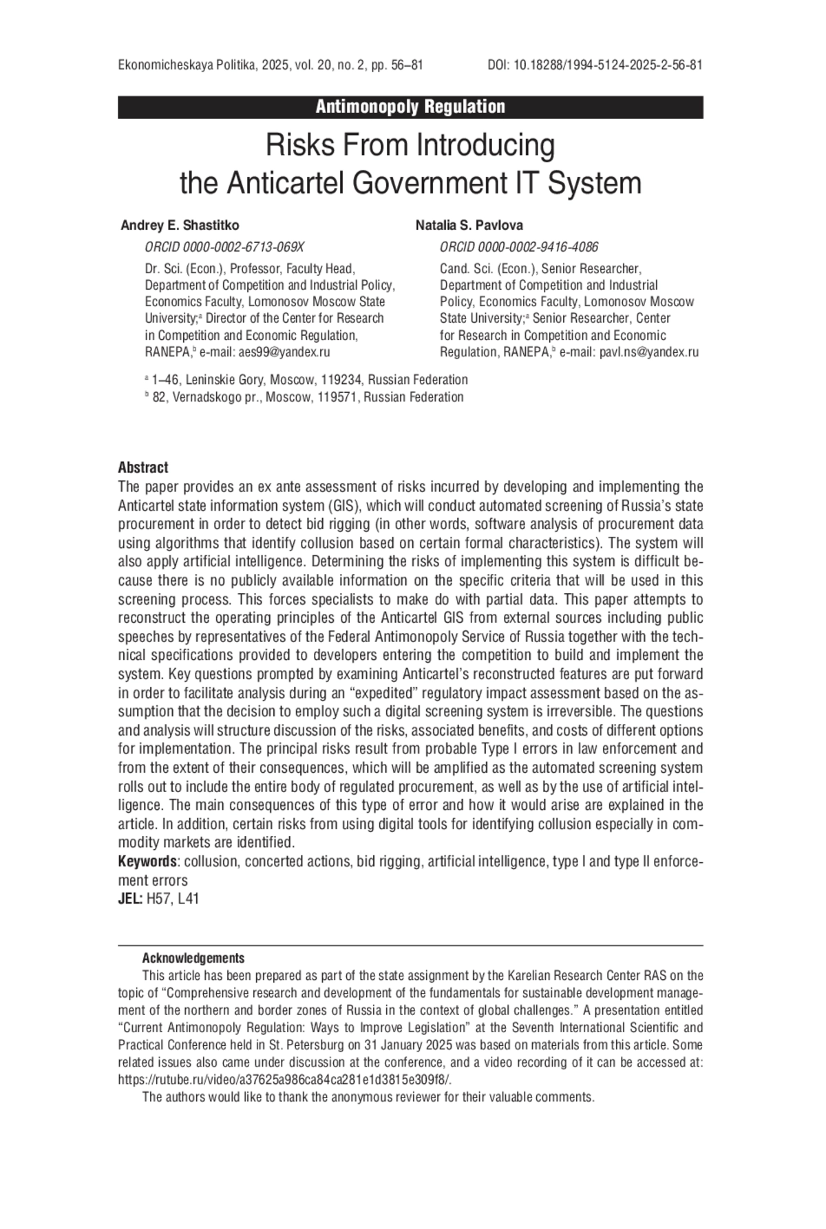 ШАСТИТКО А. Е., ПАВЛОВА Н. С. РИСКИ ВНЕДРЕНИЯ ГИС «АНТИКАРТЕЛЬ» // ЭКОНОМИЧЕСКАЯ ПОЛИТИКА. 2025. ТОМ 20, № 2