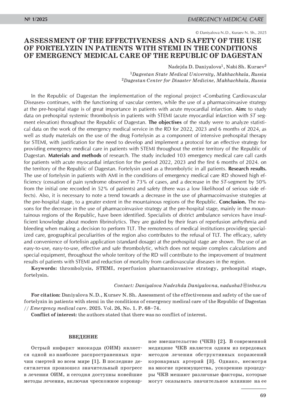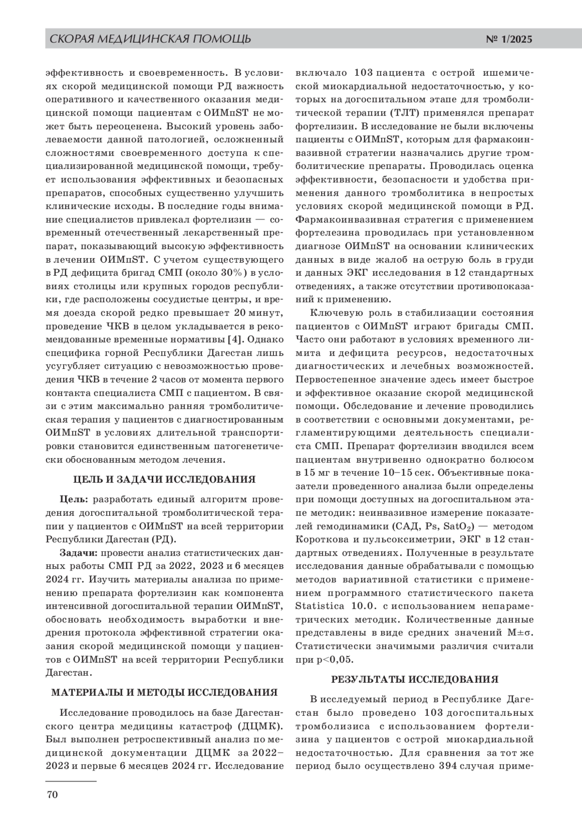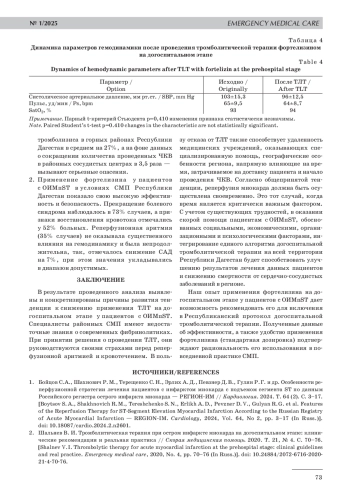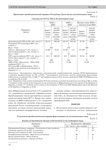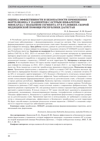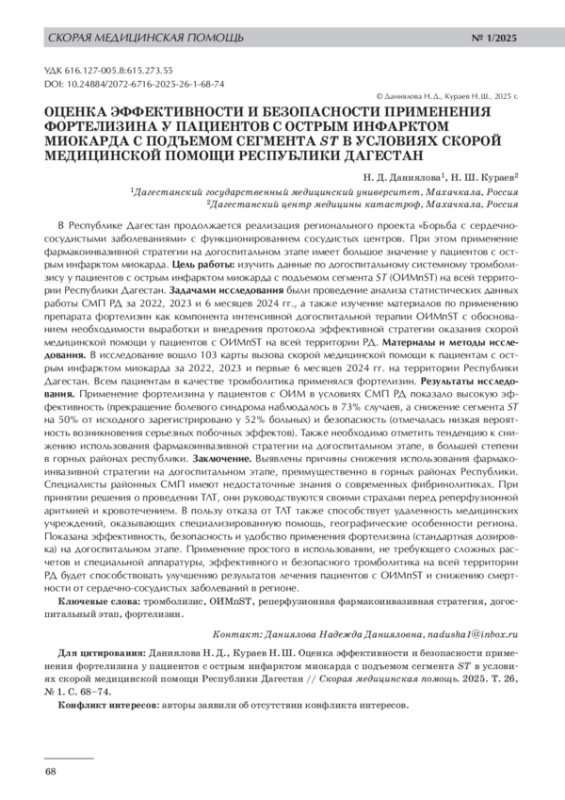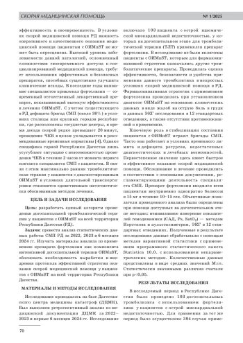 В Республике Дагестан продолжается реализация регионального проекта «Борьба с сердечно-сосудистыми заболеваниями» с функционированием сосудистых центров. При этом применение фармакоинвазивной стратегии на догоспитальном этапе имеет большое значение у пациентов с острым инфарктом миокарда. Цель работы: изучить данные по догоспитальному системному тромболизису у пациентов с острым инфарктом миокарда с подъемом сегмента ST (ОИМпST) на всей территории Республики Дагестан. Задачами исследования были проведение анализа статистических данных работы СМП РД за 2022, 2023 и 6 месяцев 2024 гг., а также изучение материалов по применению препарата фортелизин как компонента интенсивной догоспитальной терапии ОИМпST с обоснованием необходимости выработки и внедрения протокола эффективной стратегии оказания скорой медицинской помощи у пациентов с ОИМпST на всей территории РД. Материалы и методы исследования. В исследование вошло 103 карты вызова скорой медицинской помощи к пациентам с острым инфарктом миокарда за 2022, 2023 и первые 6 месяцев 2024 гг. на территории Республики Дагестан. Всем пациентам в качестве тромболитика применялся фортелизин. Результаты исследования. Применение фортелизина у пациентов с ОИМ в условиях СМП РД показало высокую эффективность (прекращение болевого синдрома наблюдалось в 73% случаев, а снижение сегмента ST на 50% от исходного зарегистрировано у 52% больных) и безопасность (отмечалась низкая вероятность возникновения серьезных побочных эффектов). Также необходимо отметить тенденцию к снижению использования фармакоинвазивной стратегии на догоспитальном этапе, в большей степени в горных районах республики. Заключение. Выявлены причины снижения использования фармакоинвазивной стратегии на догоспитальном этапе, преимущественно в горных районах Республики. Специалисты районных СМП имеют недостаточные знания о современных фибринолитиках. При принятии решения о проведении ТЛТ, они руководствуются своими страхами перед реперфузионной аритмией и кровотечением. В пользу отказа от ТЛТ также способствует удаленность медицинских учреждений, оказывающих специализированную помощь, географические особенности региона. Показана эффективность, безопасность и удобство применения фортелизина (стандартная дозировка) на догоспитальном этапе. Применение простого в использовании, не требующего сложных расчетов и специальной аппаратуры, эффективного и безопасного тромболитика на всей территории РД будет способствовать улучшению результатов лечения пациентов с ОИМпST и снижению смертности от сердечно-сосудистых заболеваний в регионе.
