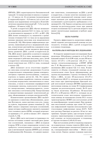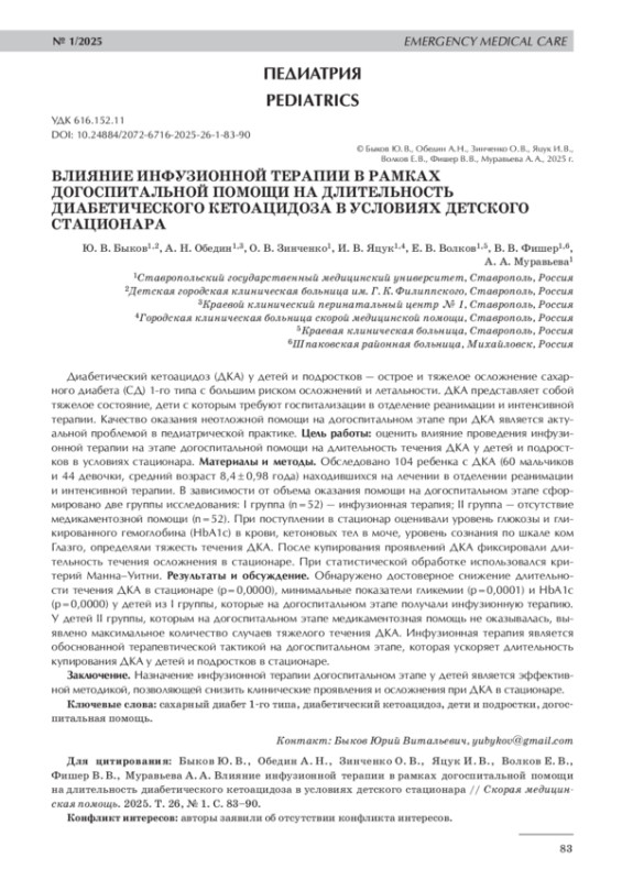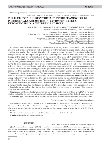 Диабетический кетоацидоз (ДКА) у детей и подростков — острое и тяжелое осложнение сахарного диабета (СД) 1‑го типа с большим риском осложнений и летальности. ДКА представляет собой тяжелое состояние, дети с которым требуют госпитализации в отделение реанимации и интенсивной терапии. Качество оказания неотложной помощи на догоспитальном этапе при ДКА является актуальной проблемой в педиатрической практике. Цель работы: оценить влияние проведения инфузионной терапии на этапе догоспитальной помощи на длительность течения ДКА у детей и подростков в условиях стационара. Материалы и методы. Обследовано 104 ребенка с ДКА (60 мальчиков и 44 девочки, средний возраст 8,4±0,98 года) находившихся на лечении в отделении реанимации и интенсивной терапии. В зависимости от объема оказания помощи на догоспитальном этапе сформировано две группы исследования: I группа (n=52) — инфузионная терапия; II группа — отсутствие медикаментозной помощи (n=52). При поступлении в стационар оценивали уровень глюкозы и гликированного гемоглобина (HbA1c) в крови, кетоновых тел в моче, уровень сознания по шкале ком Глазго, определяли тяжесть течения ДКА. После купирования проявлений ДКА фиксировали длительность течения осложнения в стационаре. При статистической обработке использовался критерий Манна–Уитни. Результаты и обсуждение. Обнаружено достоверное снижение длительности течения ДКА в стационаре (р=0,0000), минимальные показатели гликемии (р=0,0001) и HbA1c (р=0,0000) у детей из I группы, которые на догоспитальном этапе получали инфузионную терапию. У детей II группы, которым на догоспитальном этапе медикаментозная помощь не оказывалась, выявлено максимальное количество случаев тяжелого течения ДКА. Инфузионная терапия является обоснованной терапевтической тактикой на догоспитальном этапе, которая ускоряет длительность купирования ДКА у детей и подростков в стационаре.