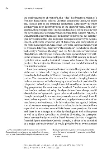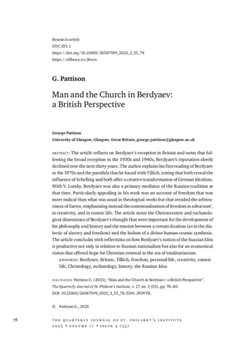В статье рассматривается отношение к Бердяеву в Великобритании и отмечается, что после широкого признания в 1930-х и 1940-х годах репутация Бердяева постепенно ухудшалась в течение следующих тридцати лет. Автор рассказывает о том, как он впервые познакомился с идеями Бердяева в 1970-х годах и какие параллели он обнаружил с идеями Тиллиха, отметив, что оба философа находились под влиянием Шеллинга и творчески переосмысливали немецкий идеализм. Вместе с В. Лосским Бердяев был одним из главных проводников русской традиции того времени. Особенно привлекательным в его работах было представление о свободе, которое было более радикальным, чем то, что обычно встречалось в богословских трудах, но при этом избегало произвольности Сартра, делая акцент на контекстуализации свободы в соборности, творчестве и космической жизни. В статье отмечаются христоцентрические и эсхатологические аспекты мировоззрения Бердяева, которые были важны для развития его философии и истории, а также напряжение между определённым дуализмом (как в диалектике рабства и свободы) и целостностью божественно-человечески-космического синтеза. В заключение статьи приводятся размышления о том, что бердяевское понятие русской идеи продуктивно не только в отношении русского национализма, но и для экуменического видения, которое даёт надежду на христианское обновление в эпоху тоталитаризма.
