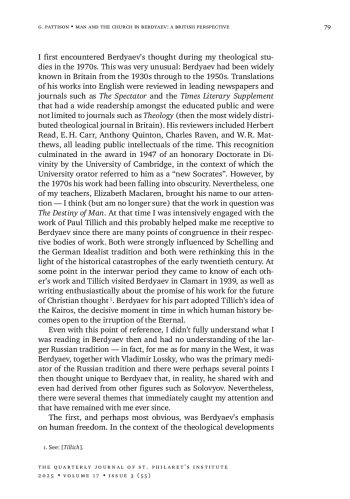 Впервые я столкнулся с идеями Бердяева во время изучения теологии в 1970-х годах. Это было очень необычно: Бердяев был широко известен в Великобритании с 1930-х по 1950-е годы. Переводы его работ на английский язык рецензировались в ведущих газетах и журналах, таких как The Spectator и Times Literary Supplement. Эти издания имели широкую читательскую аудиторию среди образованной публики и не ограничивались такими журналами, как Theology (в то время самый популярный теологический журнал в Великобритании).