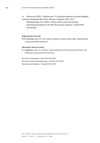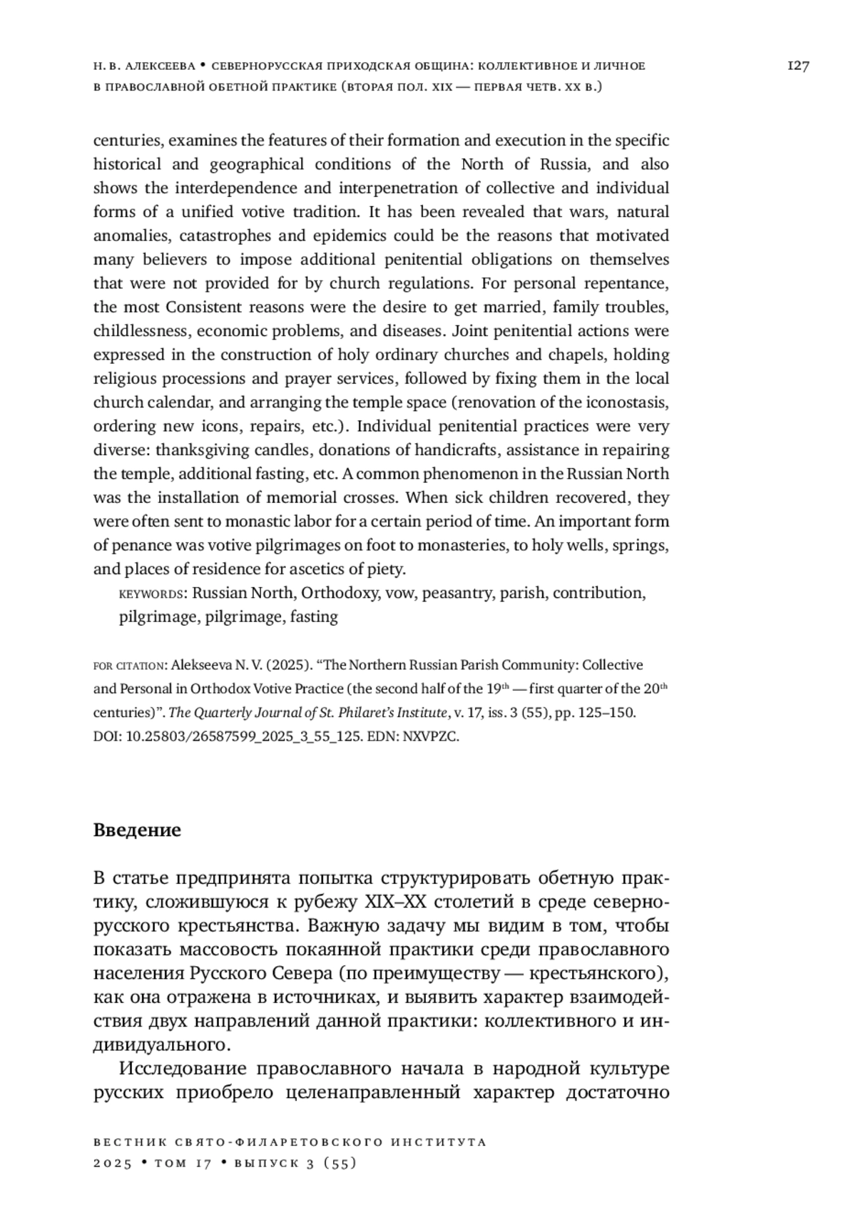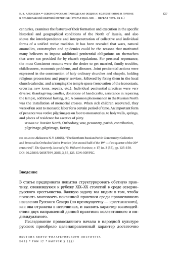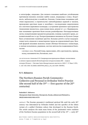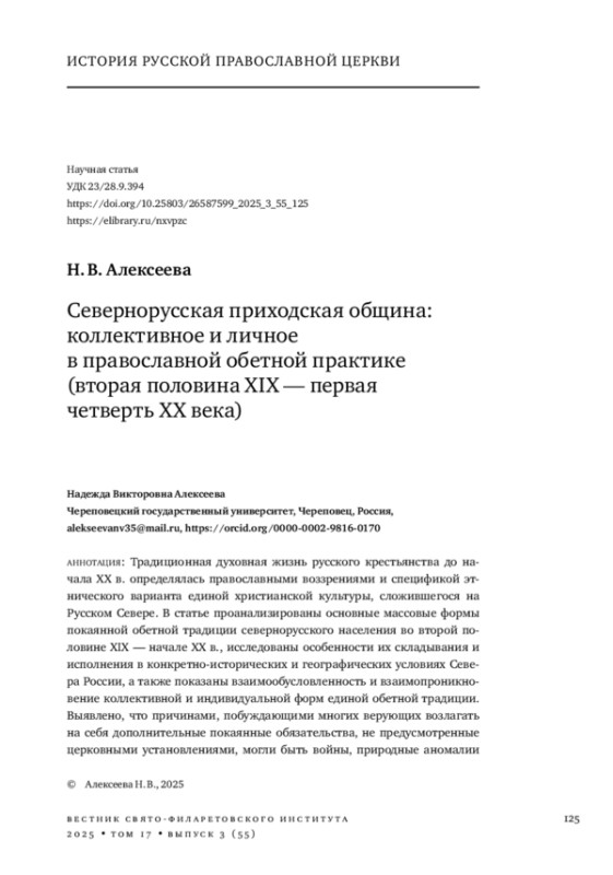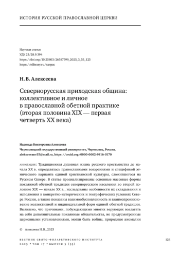 АЛЕКСЕЕВА Н. В. СЕВЕРНОРУССКАЯ ПРИХОДСКАЯ ОБЩИНА: КОЛЛЕКТИВНОЕ И ЛИЧНОЕ В ПРАВОСЛАВНОЙ ОБЕТНОЙ ПРАКТИКЕ (ВТОРАЯ ПОЛОВИНА XIX - ПЕРВАЯ ЧЕТВЕРТЬ XX ВЕКА) // ВЕСТНИК СВЯТО-ФИЛАРЕТОВСКОГО ИНСТИТУТА. 2025. № 3 (55), ТОМ 17