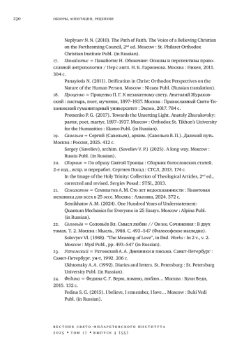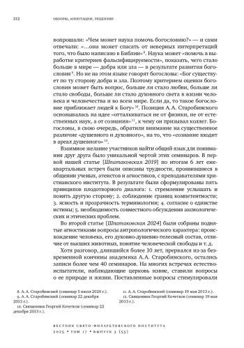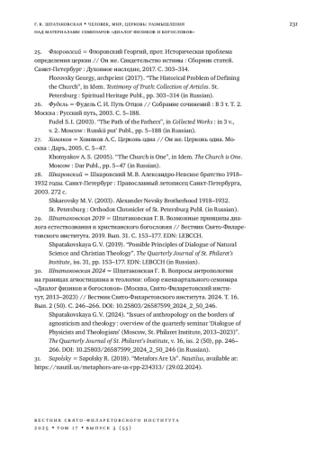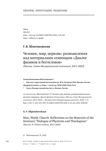 30. 	Шпатаковская Г. В. Вопросы антропологии на границах агностицизма и теологии: обзор ежеквартального семинара “Диалог физиков и богословов” (Москва, Свято-Филаретовский институт, 2013-2023) // Вестник Свято-Филаретовского института. 2024. Т. 16. Вып. 2 (50). С. 246-266. DOI: 10.25803/26587599_2024_2_50_246