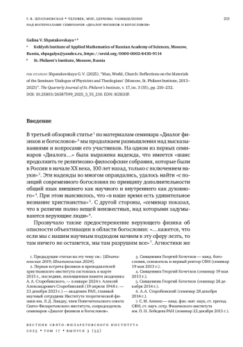В третьей обзорной статье 1 по материалам семинара «Диалог физиков и богословов» 2 мы продолжаем размышления над высказываниями и вопросами его участников. На одном из первых семинаров «Диалога…» была выражена надежда, что имеется «шанс продолжить те религиозно-философские собрания, которые были в России в начале XX века, 100 лет назад, только с включением науки» 3. Эти надежды во многом оправдались, удалось найти «с позиций современного богословия по принципу дополнительности общий язык внешнего как научного и внутреннего как духовного» 4. При этом выяснилось, что «в наше время есть удивительное незнание христианства» 5. С другой стороны, «семинар показал, что в религии полно вещей неизвестных, над которыми задумываются верующие люди» 6.