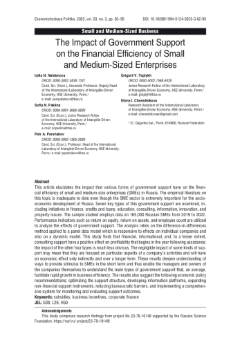 Настоящая статья посвящена исследованию воздействия разных видов государственной поддержки на финансовую эффективность малых и средних предприятий (МСП) в России. Актуальность статьи обусловлена высокой важностью сектора МСП для социально-экономического развития России и слабой изученностью темы в эмпирической литературе. Рассматриваются семь типов поддержки: финансовая, кредитная, имущественная, инновационная, образовательная, консультационная и информационная. Выборка включает информацию о 165 тыс. российских МСП в период с 2019 по 2022 год. Анализ проведен с помощью методологии «разность разностей» в рамках модели анализа панельных данных с индивидуальными эффектами компаний, а также посредством динамической модели. Выявлено, что финансовая, информационная и в меньшей степени консультационная поддержка положительно влияют на рентабельность начиная со следующего года после оказания помощи; влияние других типов не столь очевидно. Незначимость ряда инструментов поддержки может означать, что они ориентированы на отдельные аспекты деятельности фирмы и дают экономический эффект не напрямую, а опосредованно и в более длительной перспективе. Полученные результаты углубляют понимание возможностей стимулирования МСП в краткосрочной перспективе. С точки зрения менеджеров и собственников самих компаний, результаты показывают ключевые типы господдержки, которые обеспечивают быстрый рост эффективности бизнеса. Кроме того, они позволяют сформулировать ряд рекомендаций для экономической политики: разработка информационных платформ, снижение бюрократических барьеров, а также оптимизация структуры и развитие нефинансовых инструментов, внедрение комплексной системы мониторинга и оценки результатов поддержки.
