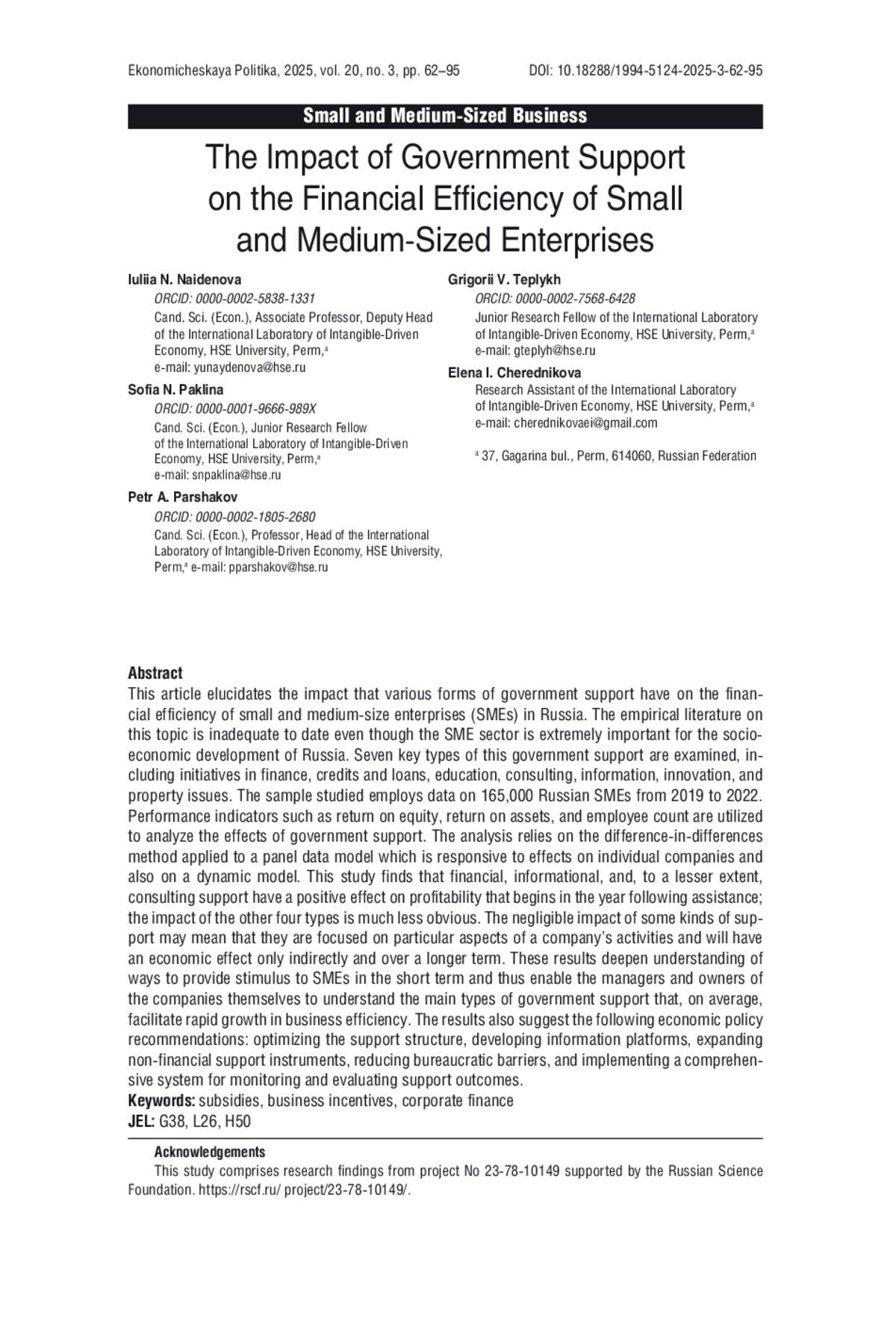 Ряд статей концентрируется на изучении драйверов деловой активности российских МСП, в том числе инструментов государственной политики. Анализ сектора МСП на уровне регионов за 2008–2019 годы выявил положительную значимость уровня доходов, низких инвестиционных рисков, доступа к рынкам сбыта и банковским кредитам; доля госсектора оказывает негативное влияние, а цифровизация дает противоречивый эффект [Земцов и др., 2021].