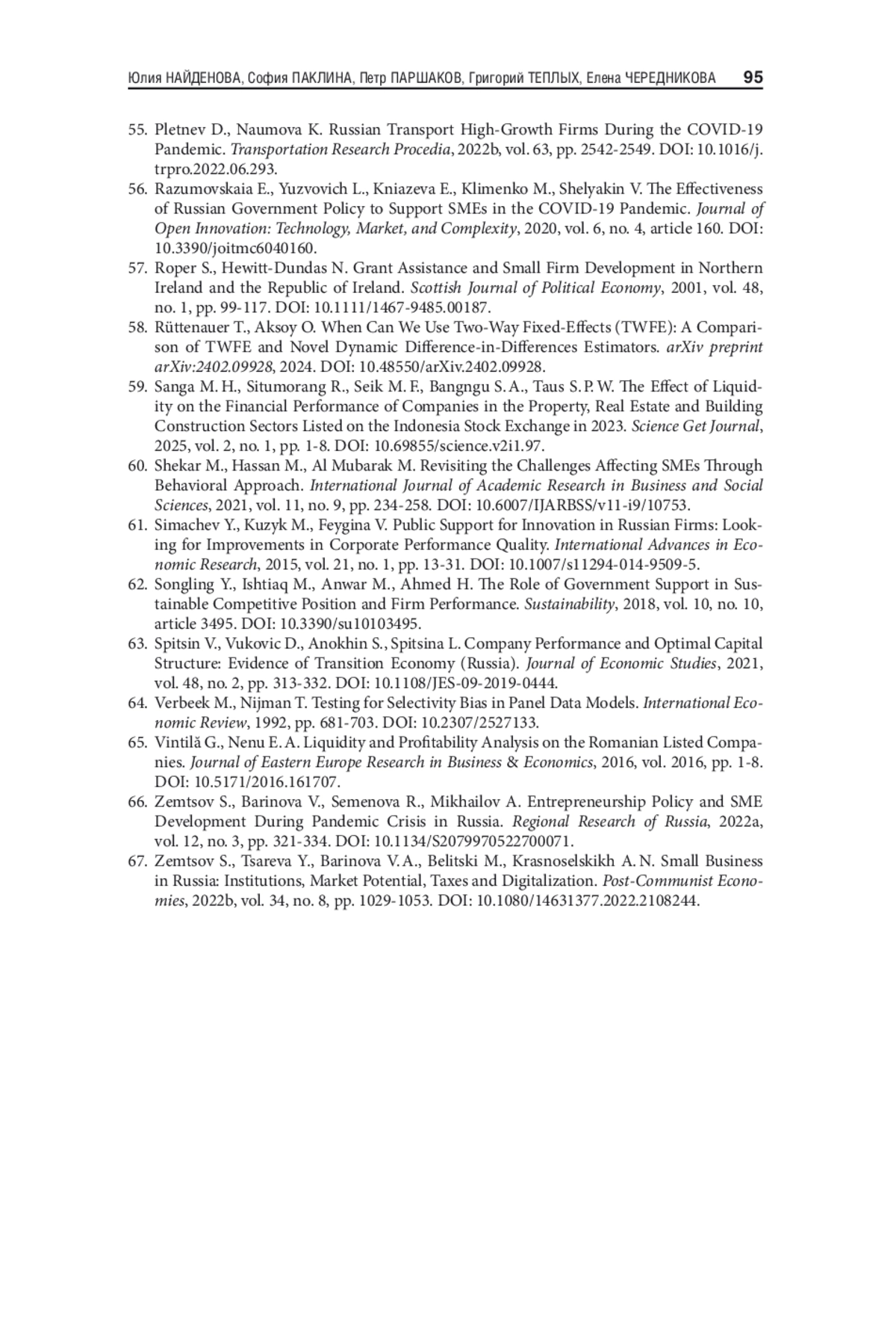 55. Pletnev D., Naumova K. Russian Transport High-Growth Firms During the COVID-19 Pandemic // Transportation Research Procedia. 2022b. Vol. 63. P. 2542-2549. https://doi.org/10.1016/j.trpro.2022.06.293.