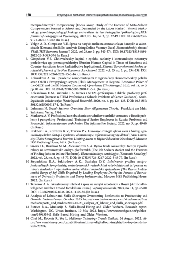 1. Весманов С. В., Жадько Н. В., Весманов Д. С., Акопян Г. А. Исследование методом фокус-группы содержания формируемых в школе и востребованных рынком труда метапредметных компетенций // Вестник Московского городского педагогического университета. Серия: Педагогика и психология. 2022. Т. 16. № 3. С. 32-49. https://doi.org/10.25688/2076-9121.2022.16.3.02.